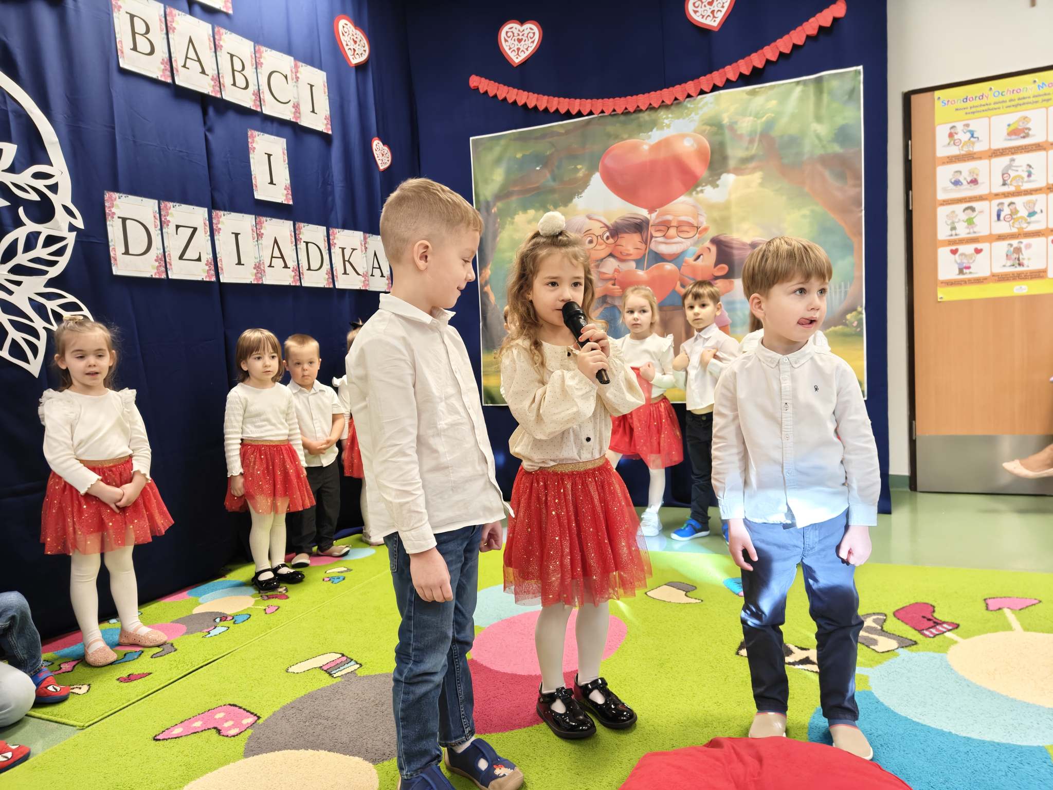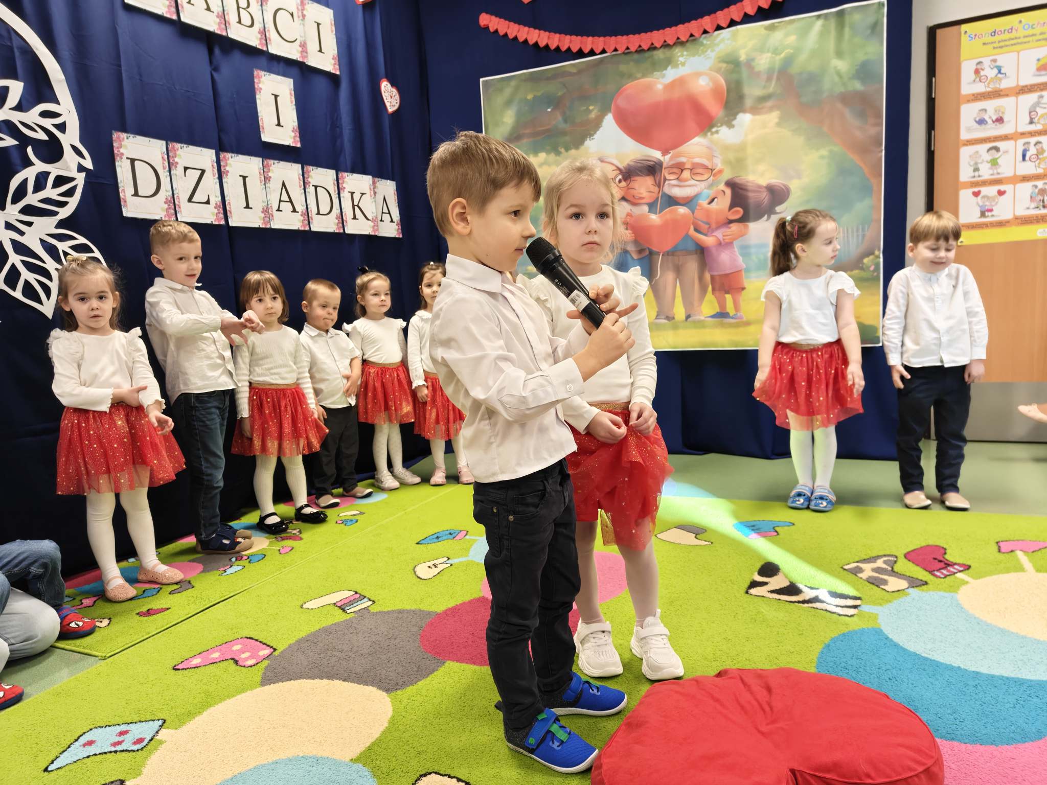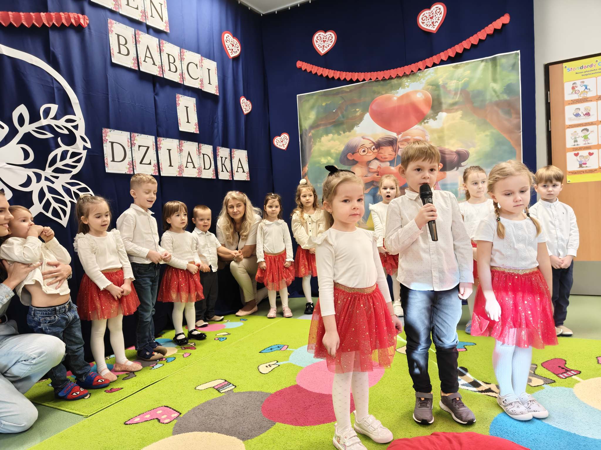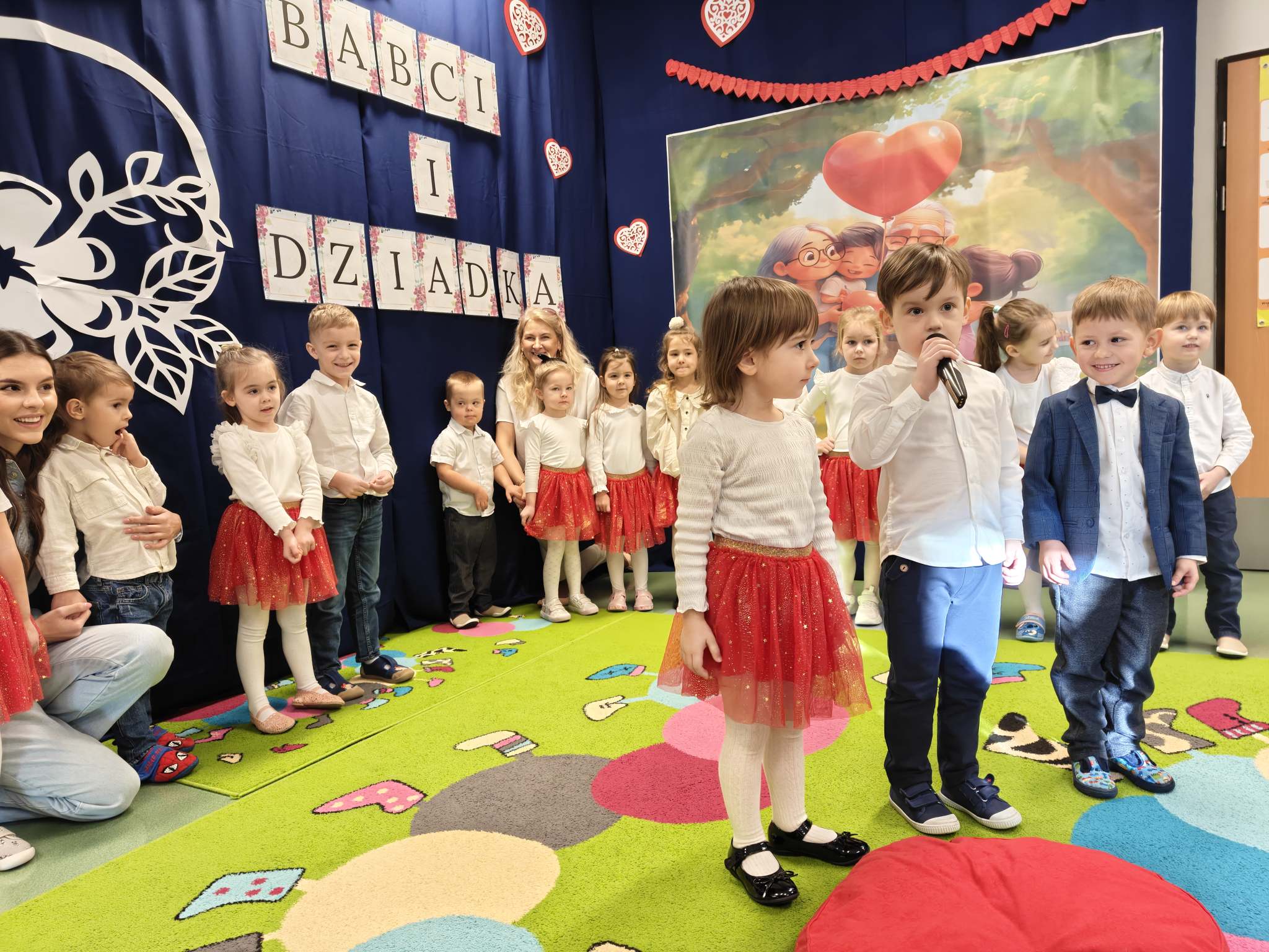 Z okazji Dnia Babci i Dziadka nasze wspaniałe 4-latki przygotowały wyjątkowy występ artystyczny, pełen radości, uśmiechu i dziecięcej energii. Mali artyści z ogromnym zaangażowaniem zaprezentowali wierszyki, piosenki oraz układ taneczny, które były wyrazem miłości i wdzięczności dla swoich ukochanych Babć i Dziadków. Występ dostarczył wielu wzruszeń i był pięknym dowodem na to, jak ważne miejsce w sercach dzieci zajmują dziadkowie. Publiczność nagrodziła przedszkolaków gromkimi brawami, a na twarzach gości nie brakowało łez wzruszenia i dumy. Dziękujemy naszym małym wykonawcom za wspaniały występ, a wszystkim Babciom i Dziadkom składamy jeszcze raz najserdeczniejsze życzenia zdrowia, radości i wielu powodów do uśmiechu.
