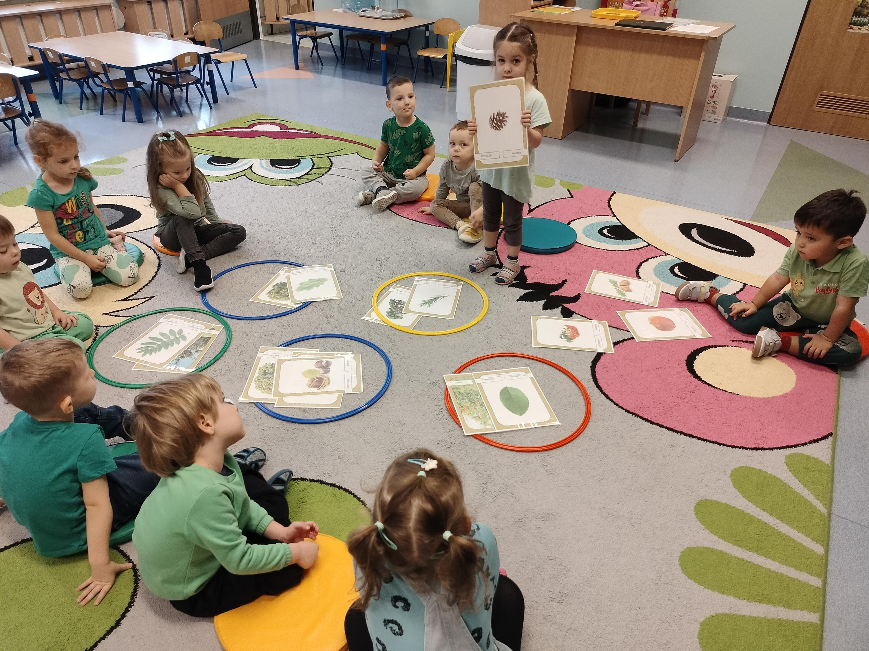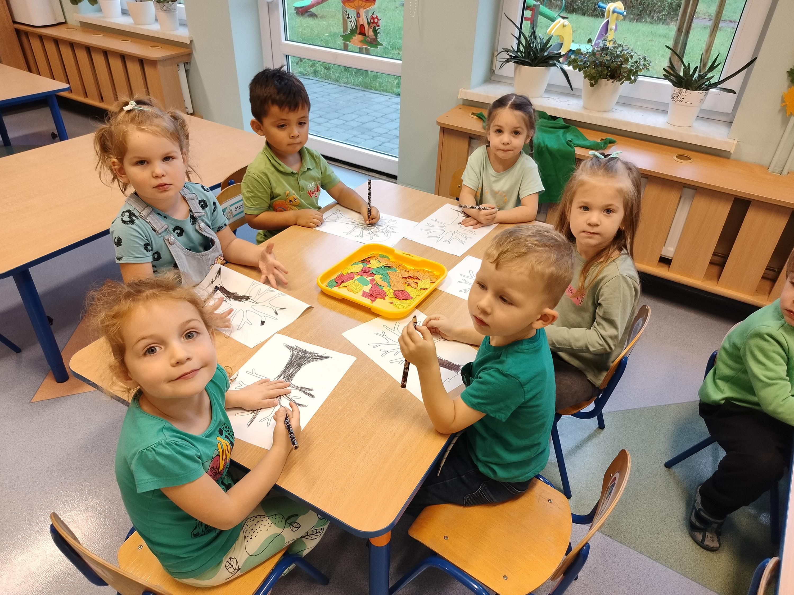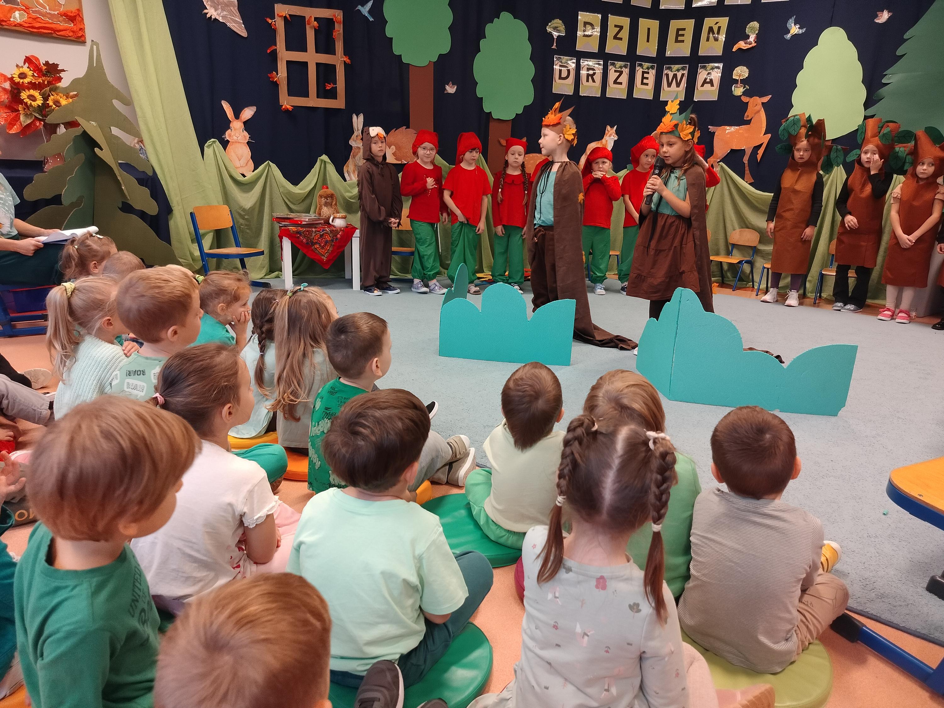 10 października obchodzimy w Polsce Dzień Drzewa. Z okazji tego święta w naszej grupie odbyły się zajęcia związane z tematyką drzew, których celem było rozbudzenie zamiłowania do przyrody oraz zwiększenie świadomości ekologicznej. Dzieci poprzez zabawę poznały rodzaje drzew, ich znaczenie dla człowieka, zwierząt i przyrody. Dowiedziały się również jak wielkie znaczenie mają drzewa dla czystości powietrza. Tego dnia uczestniczyliśmy również w przedstawieniu w wykonaniu dzieci z grupy „Elfy” pt. „Leśne opowieści” oraz odwiedził nas Pan Leśnik z Lasów Państwowych Nadleśnictwa Bełchatów. „Krasnale” wykonały także pracę plastyczną ,,Jesienne drzewo”.