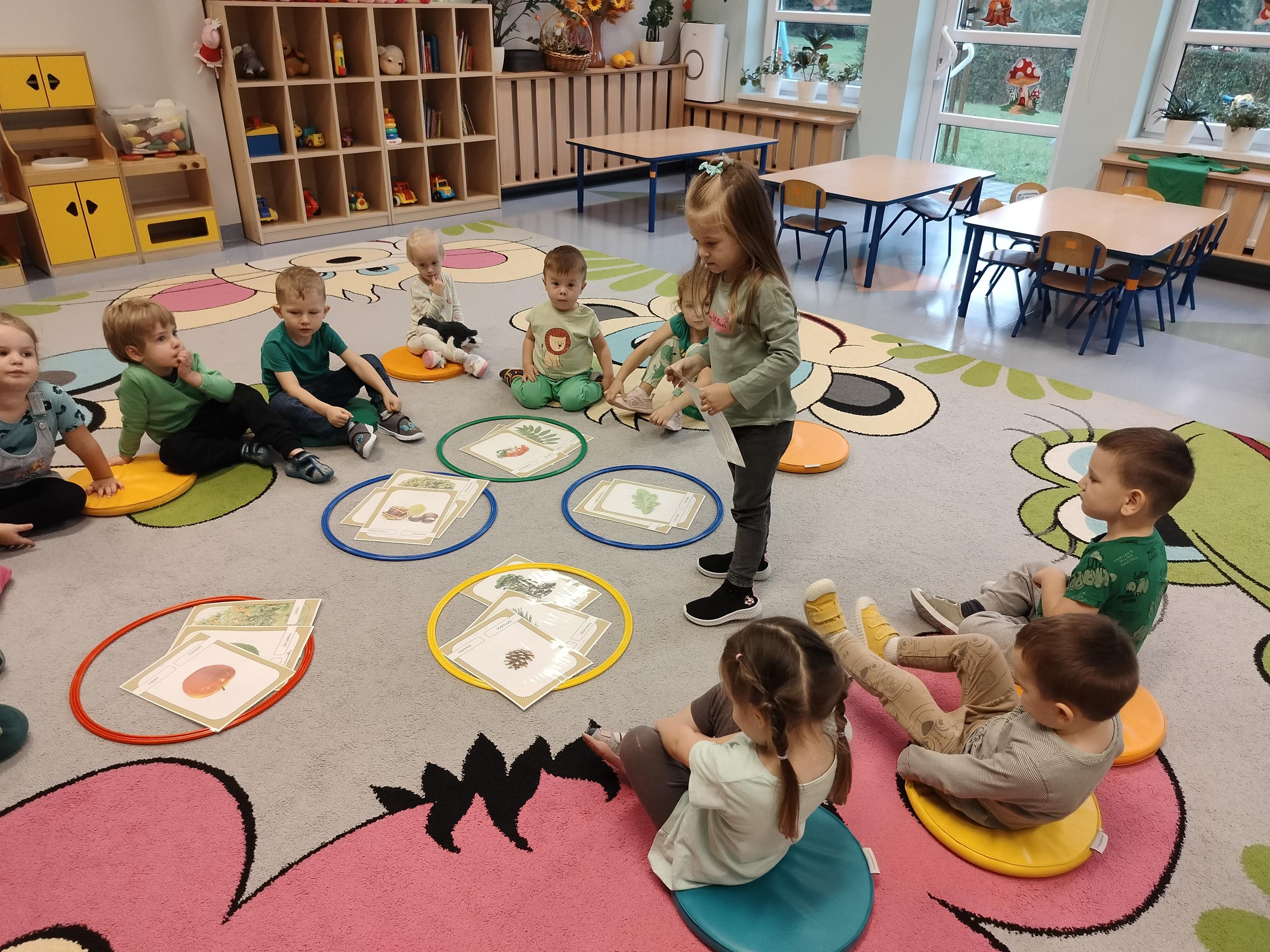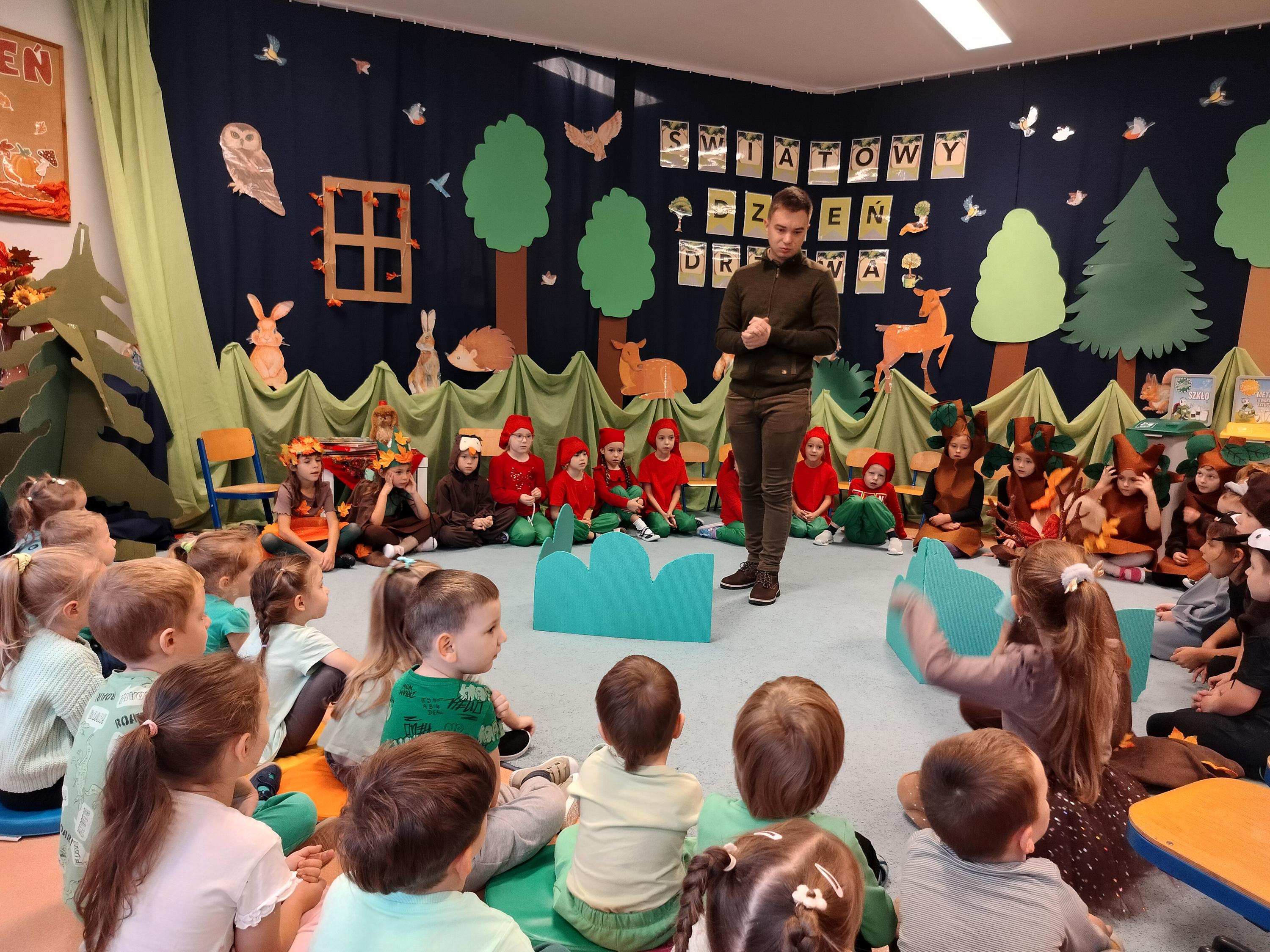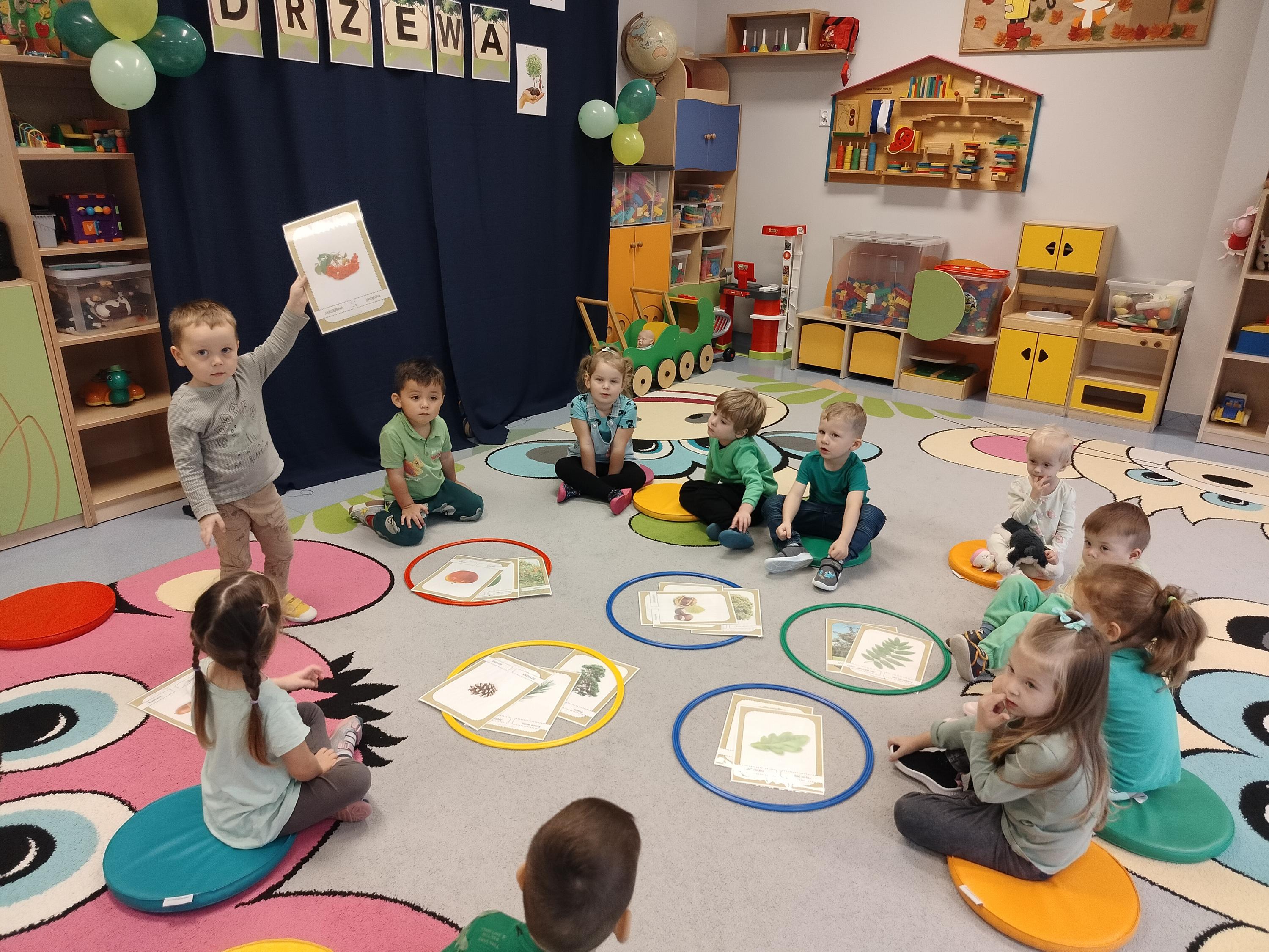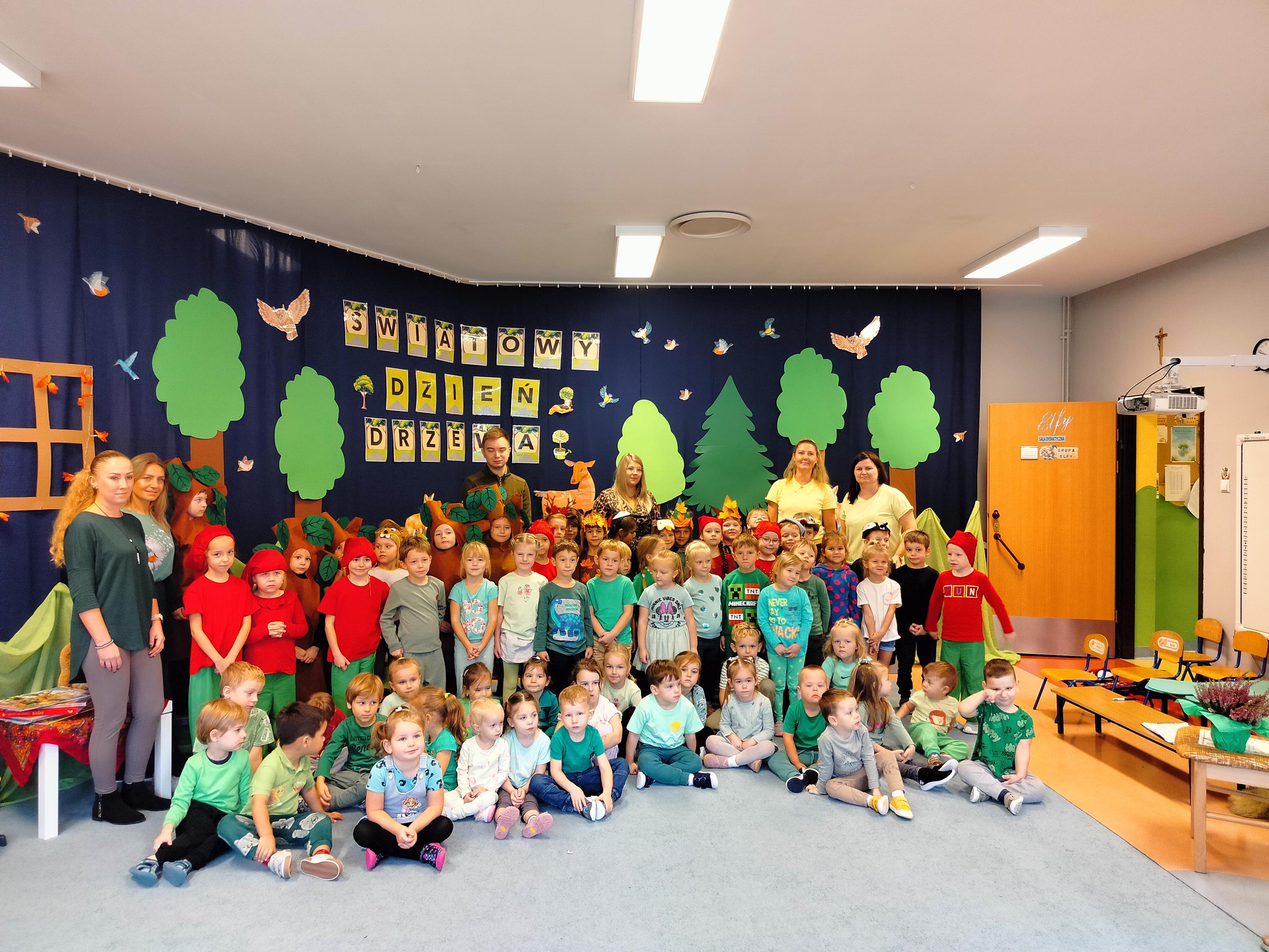 10 października obchodzimy w Polsce Dzień Drzewa. Z okazji tego święta w naszej grupie odbyły się zajęcia związane z tematyką drzew, których celem było rozbudzenie zamiłowania do przyrody oraz zwiększenie świadomości ekologicznej. Dzieci poprzez zabawę poznały rodzaje drzew, ich znaczenie dla człowieka, zwierząt i przyrody. Dowiedziały się również jak wielkie znaczenie mają drzewa dla czystości powietrza. Tego dnia uczestniczyliśmy również w przedstawieniu w wykonaniu dzieci z grupy „Elfy” pt. „Leśne opowieści” oraz odwiedził nas Pan Leśnik z Lasów Państwowych Nadleśnictwa Bełchatów. „Krasnale” wykonały także pracę plastyczną ,,Jesienne drzewo”.