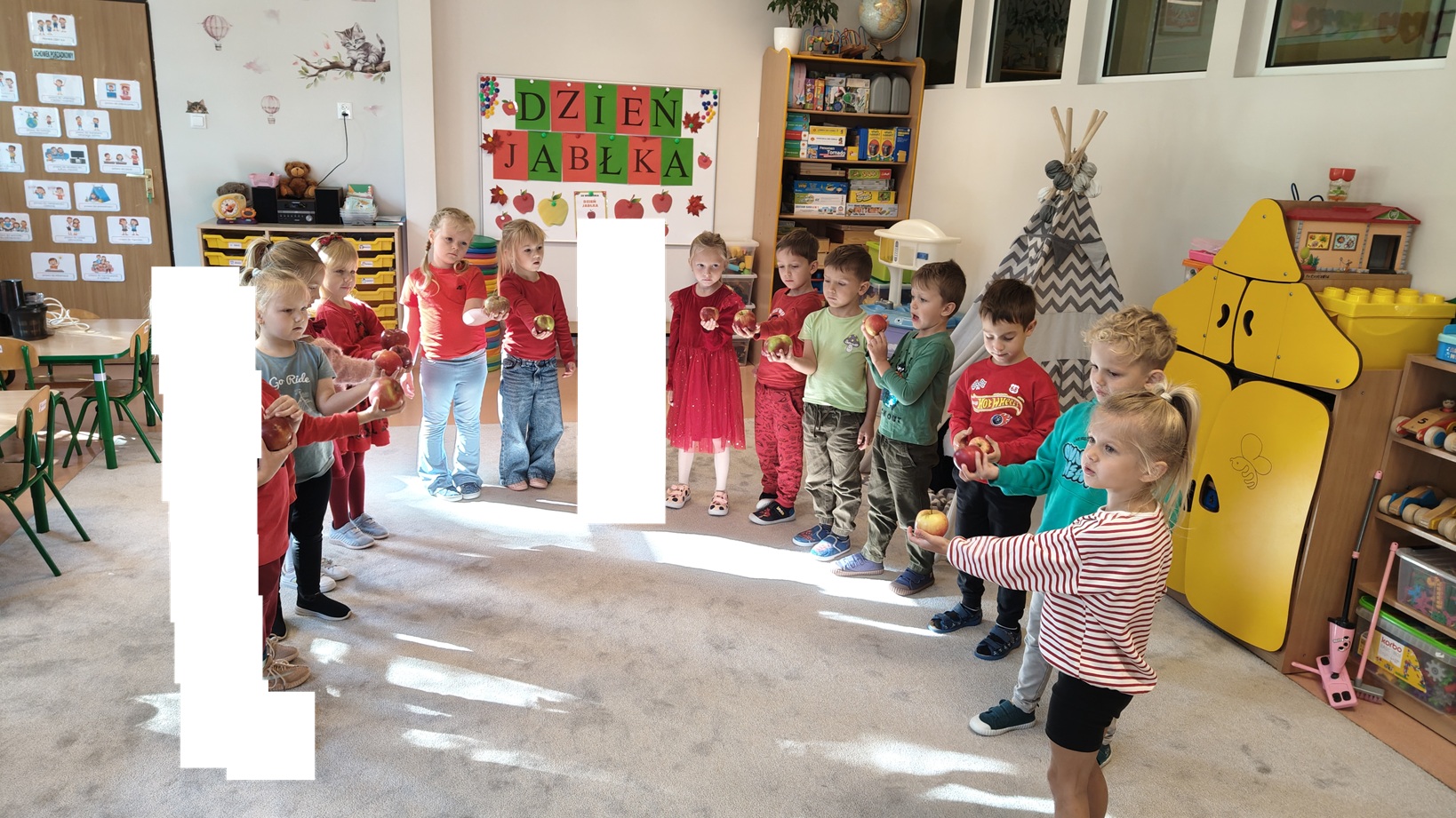 Dnia 26 września w naszym przedszkolu obchodziliśmy Dzień Jabłka. W tym dniu dzieci z grupy Kotki poznawały ten owoc, różne gatunki, rozpoznawały kształt, zapach, kolor i smak. Zdobywały wiadomości na temat potraw i przetworów jakie można przygotować z tych owoców. Dzieci przygotowały również sok ze świeżo wyciskanych jabłek. Takie dni zachęcają dzieci do sięgania po owoce i warzywa oraz promują zdrowy styl życia. To był bardzo ciekawy i jabłkowy dzień.