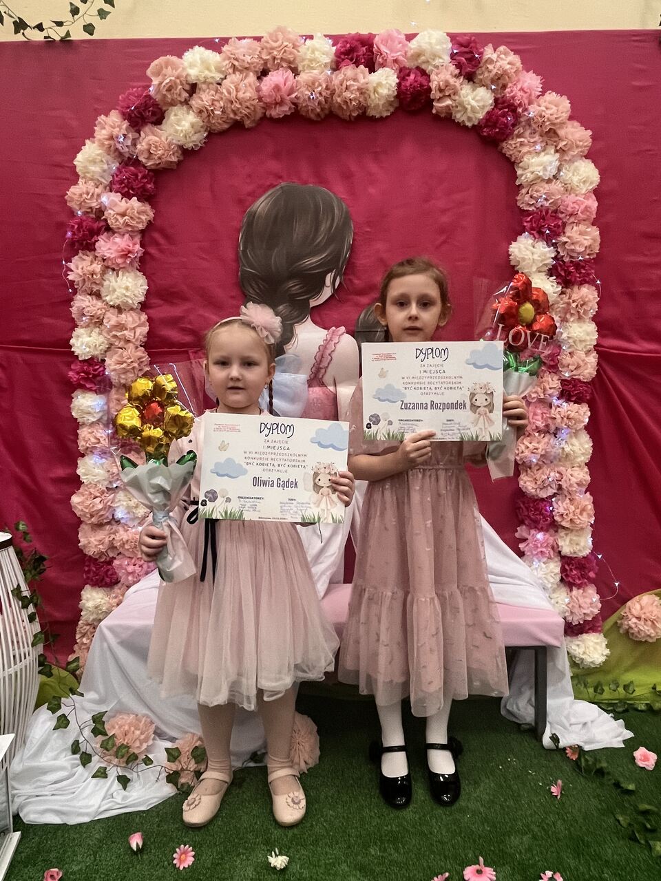 10 marca odbył się Międzyprzedszkolny Konkurs Recytatorski „Być kobietą, być kobietą”, organizowany przez Przedszkole Samorządowe nr 6 im. Marii Konopnickiej.Nasze przedszkole reprezentowały dwie dziewczynki: Zuzanna Rozpondek z grupy "Elfy" oraz Oliwia Gądek z grupy "Kotki". Dziewczynki zaprezentowały się wspaniale i zdobyły I miejsce. Serdecznie gratulujemy naszym uczestniczkom oraz wszystkim dziewczynkom biorącym udział w konkursie. Jesteśmy bardzo dumni!