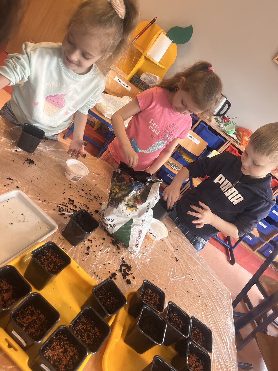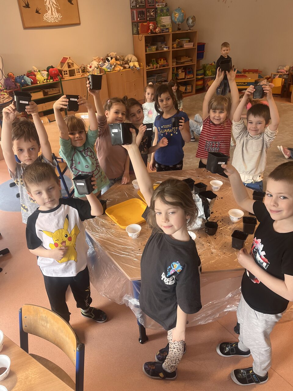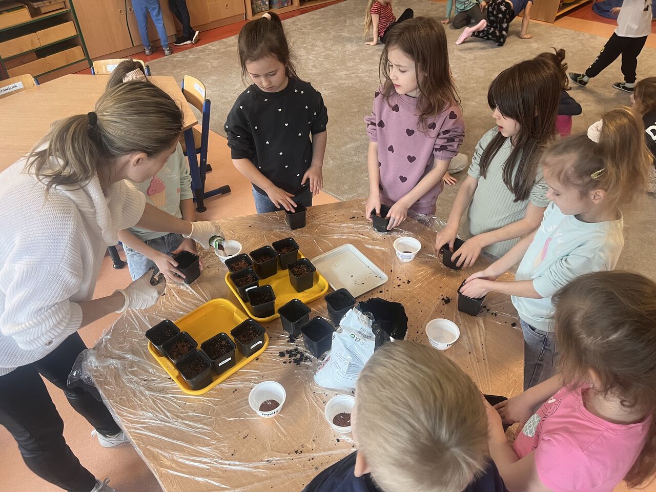 Podczas zajęć dzieci wzięły udział w krótkiej pogadance na temat tego, czego potrzebują rośliny do wzrostu. Dowiedziały się, jak ważne są: woda, światło, powietrze oraz odpowiednia gleba. Następnie przystąpiły do działania – samodzielnie przygotowywały swoje doniczki, wsypywały ziemię, a potem siały nasionka rzeżuchy. Każdy pracował z dużym zaangażowaniem i ciekawością, obserwując kolejne etapy pracy. Na zakończenie dzieci zabrały swoje uprawy do domu, aby móc dalej je pielęgnować i obserwować, jak roślinki rosną każdego dnia. To była nie tylko świetna zabawa, ale także cenna lekcja przyrody!