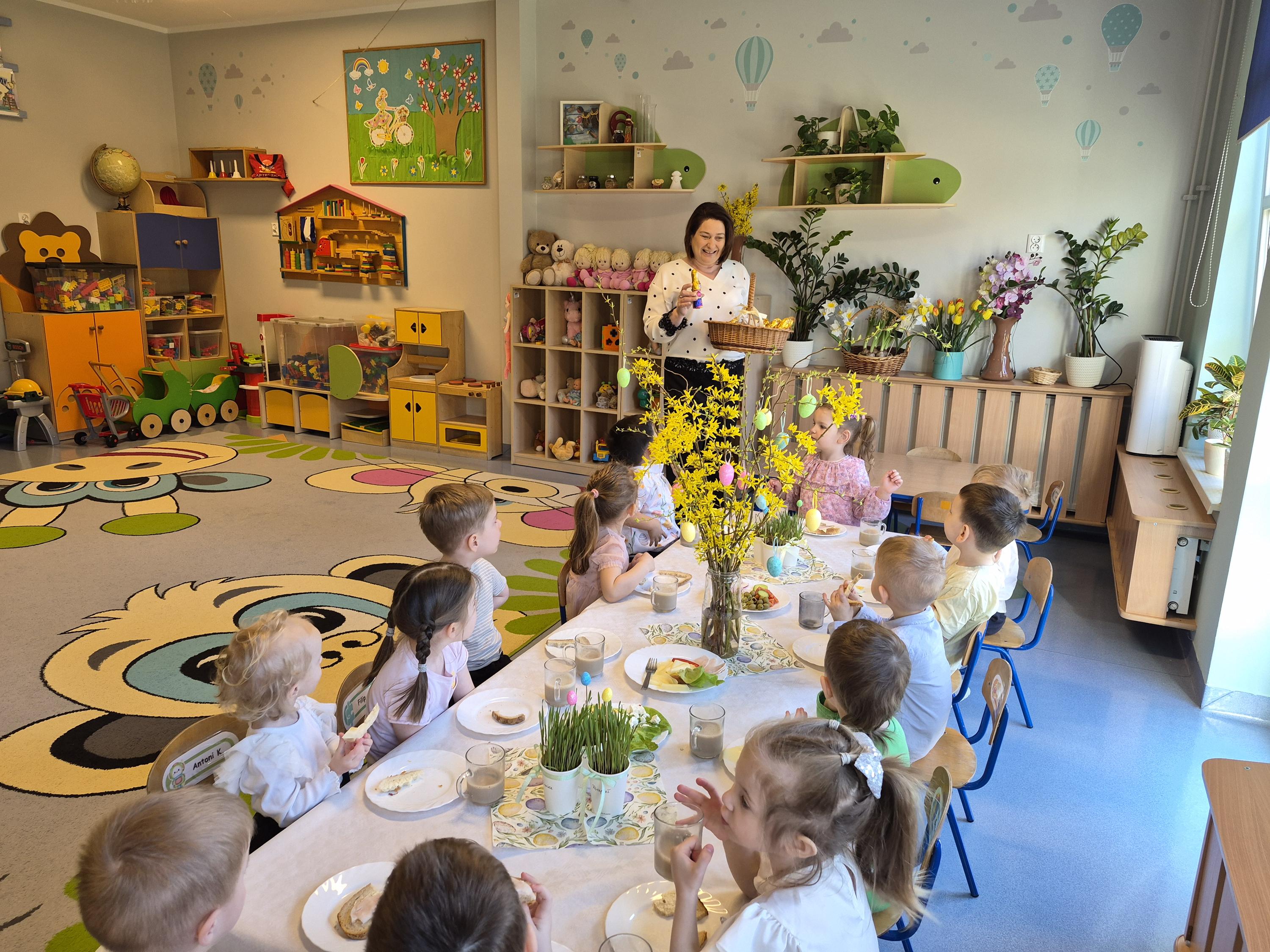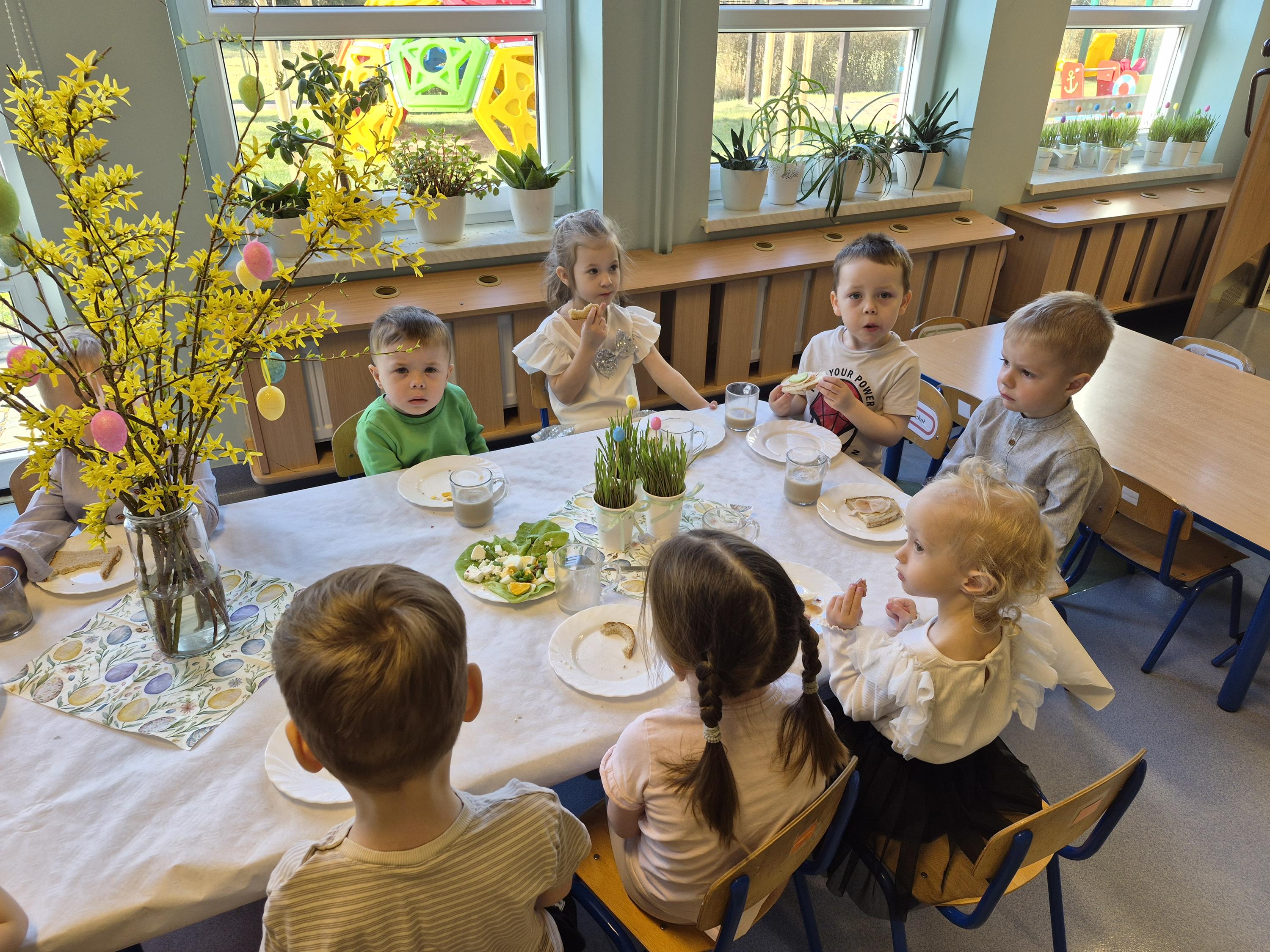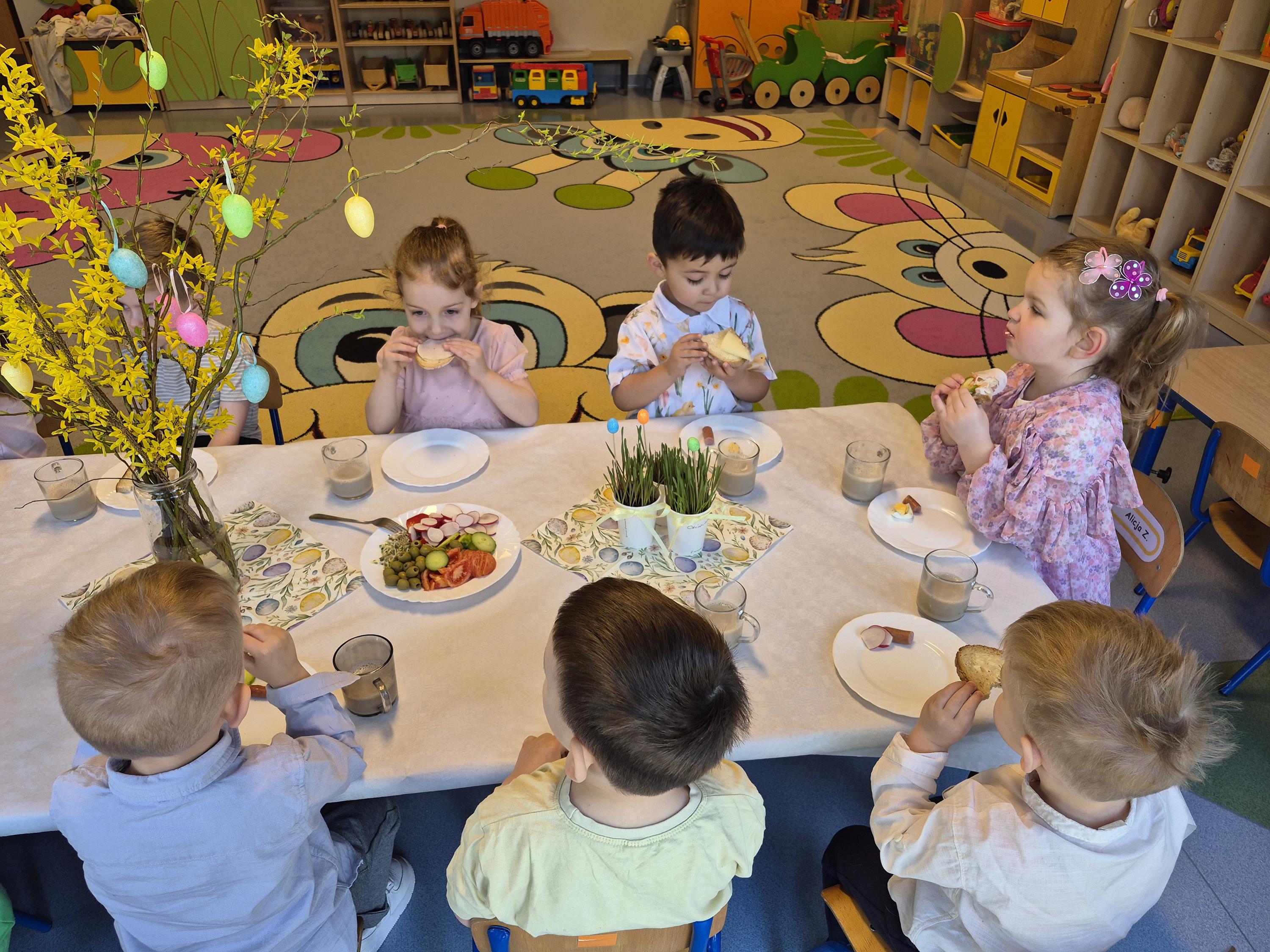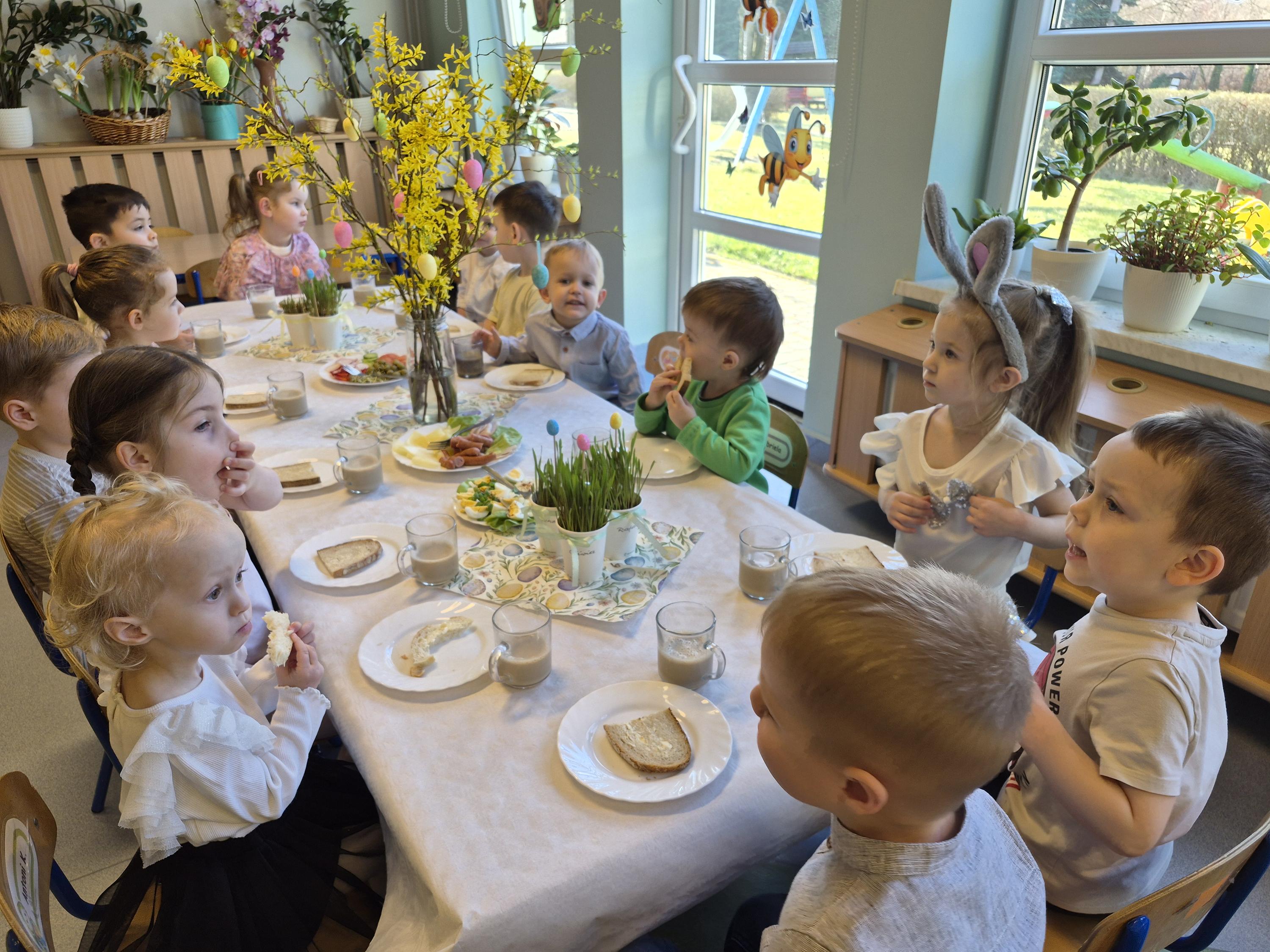 Śniadanie Wielkanocne w grupie „Krasnali” było bardzo uroczyste. Dzieci przyszły odświętnie ubrane i z wielką radością zasiadły do stołu. Na udekorowanych stołach były tradycyjne potrawy wielkanocne. Przed rozpoczęciem posiłku wszyscy złożyli sobie świąteczne życzenia. W trakcie śniadania panowała miła atmosfera, pełna uśmiechu i wspólnych rozmów. Po śniadaniu odbyło się przedstawienie wielkanocne w wykonaniu dzieci z kółka teatralnego.