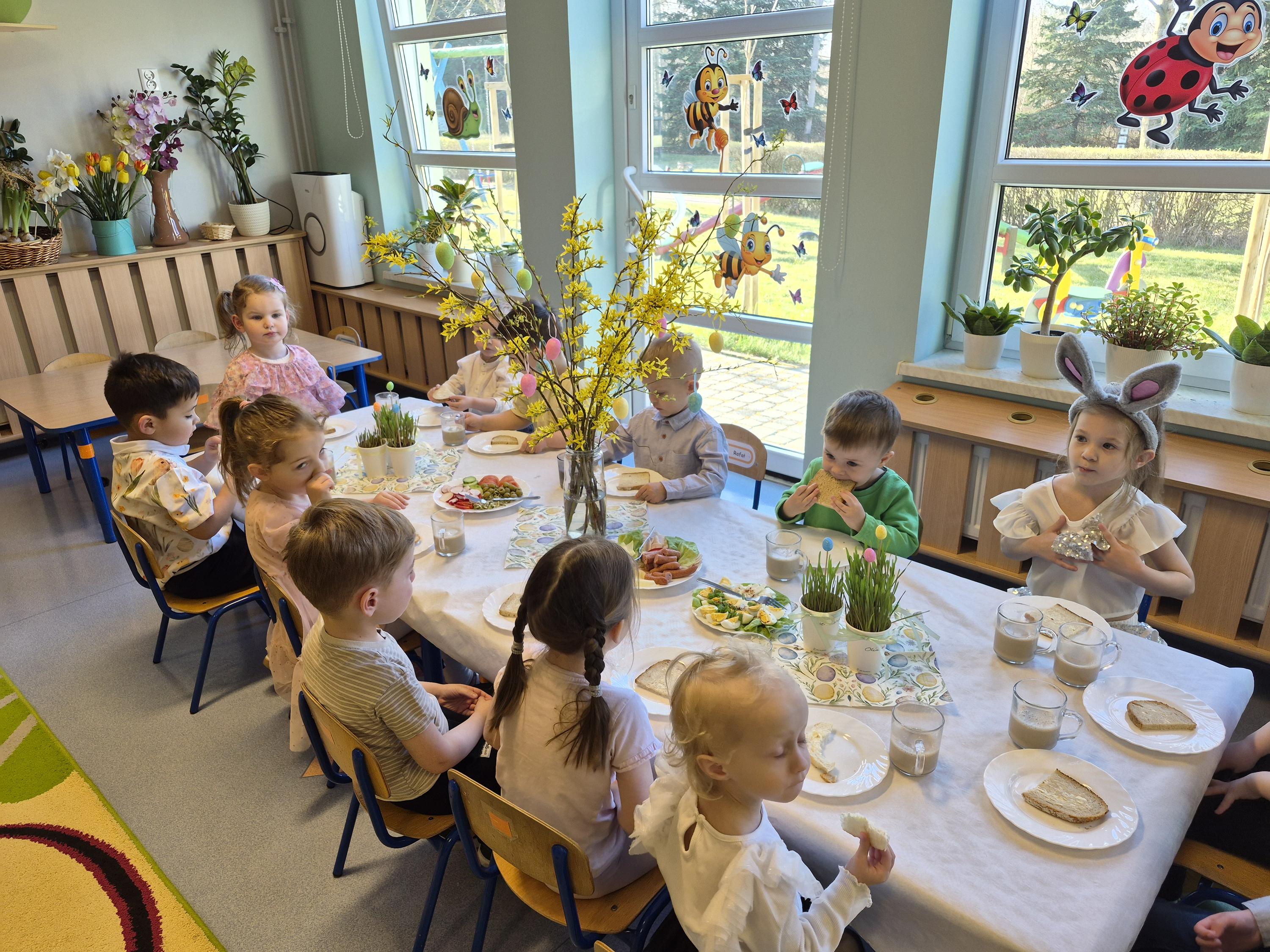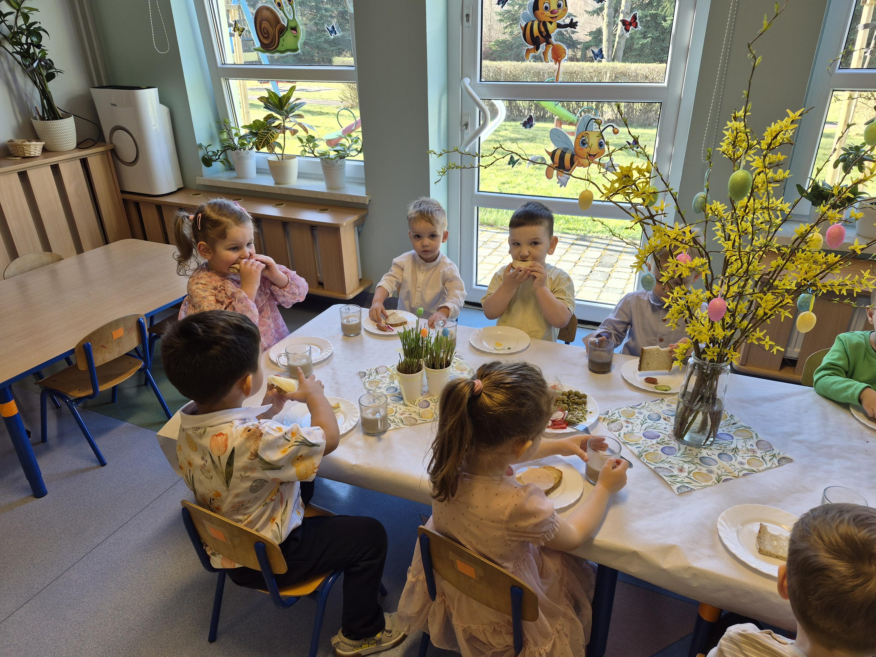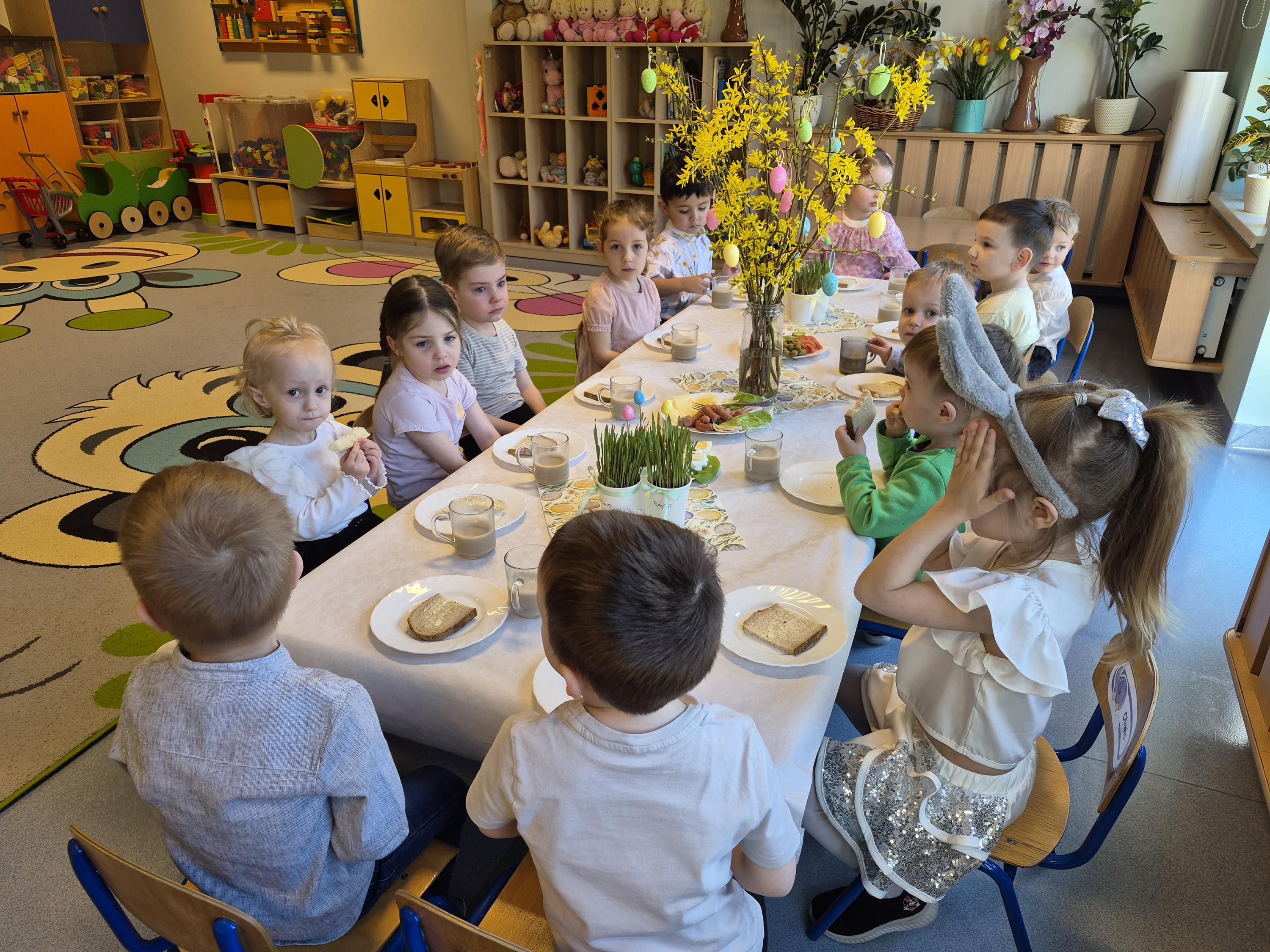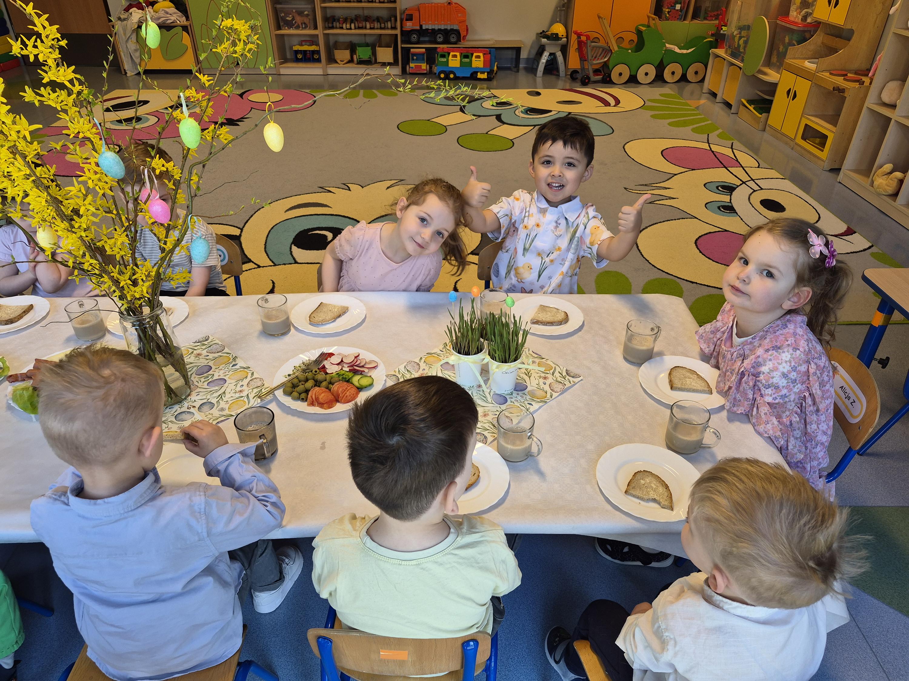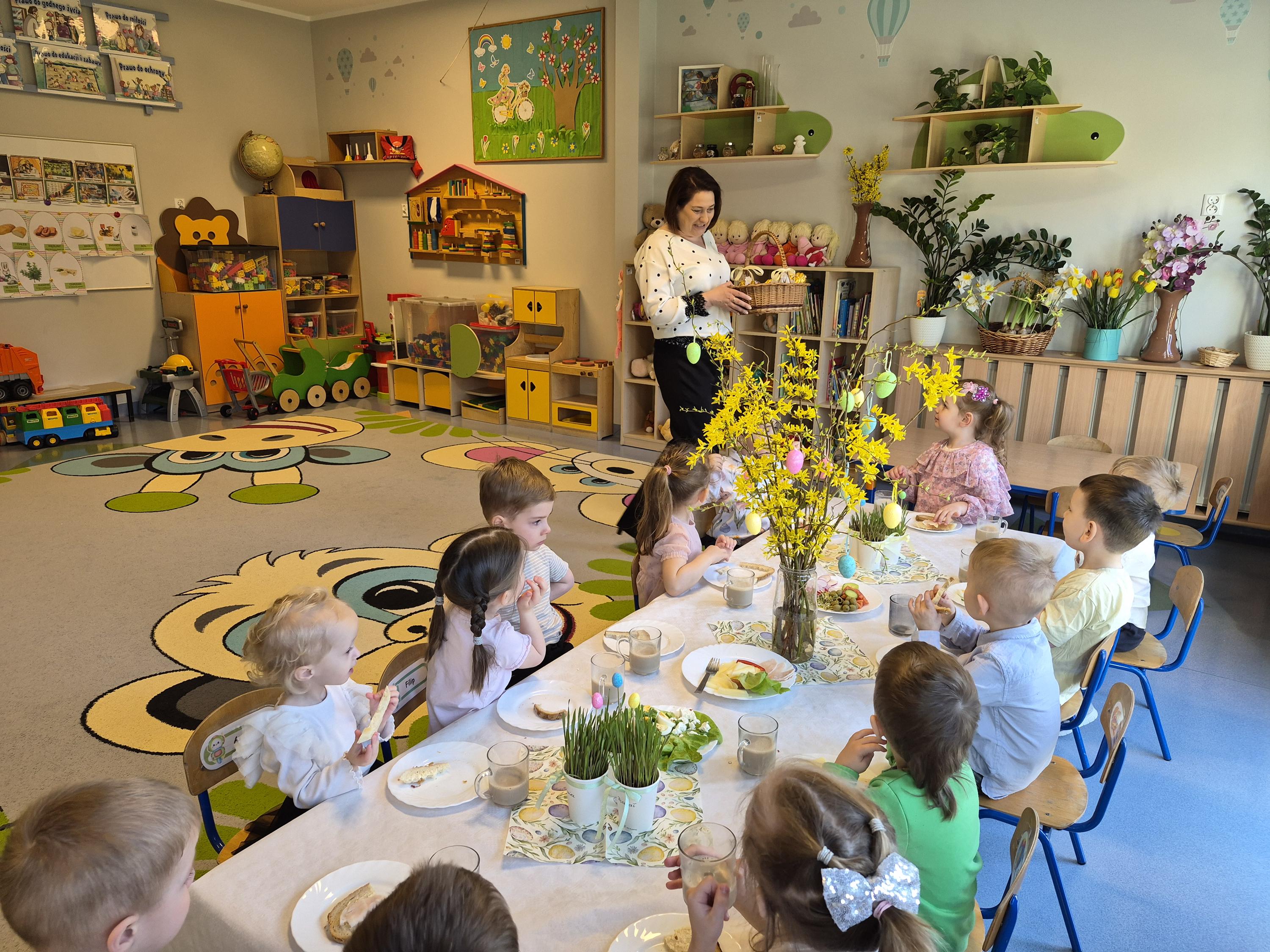 Śniadanie Wielkanocne w grupie „Krasnali” było bardzo uroczyste. Dzieci przyszły odświętnie ubrane i z wielką radością zasiadły do stołu. Na udekorowanych stołach były tradycyjne potrawy wielkanocne. Przed rozpoczęciem posiłku wszyscy złożyli sobie świąteczne życzenia. W trakcie śniadania panowała miła atmosfera, pełna uśmiechu i wspólnych rozmów. Po śniadaniu odbyło się przedstawienie wielkanocne w wykonaniu dzieci z kółka teatralnego.