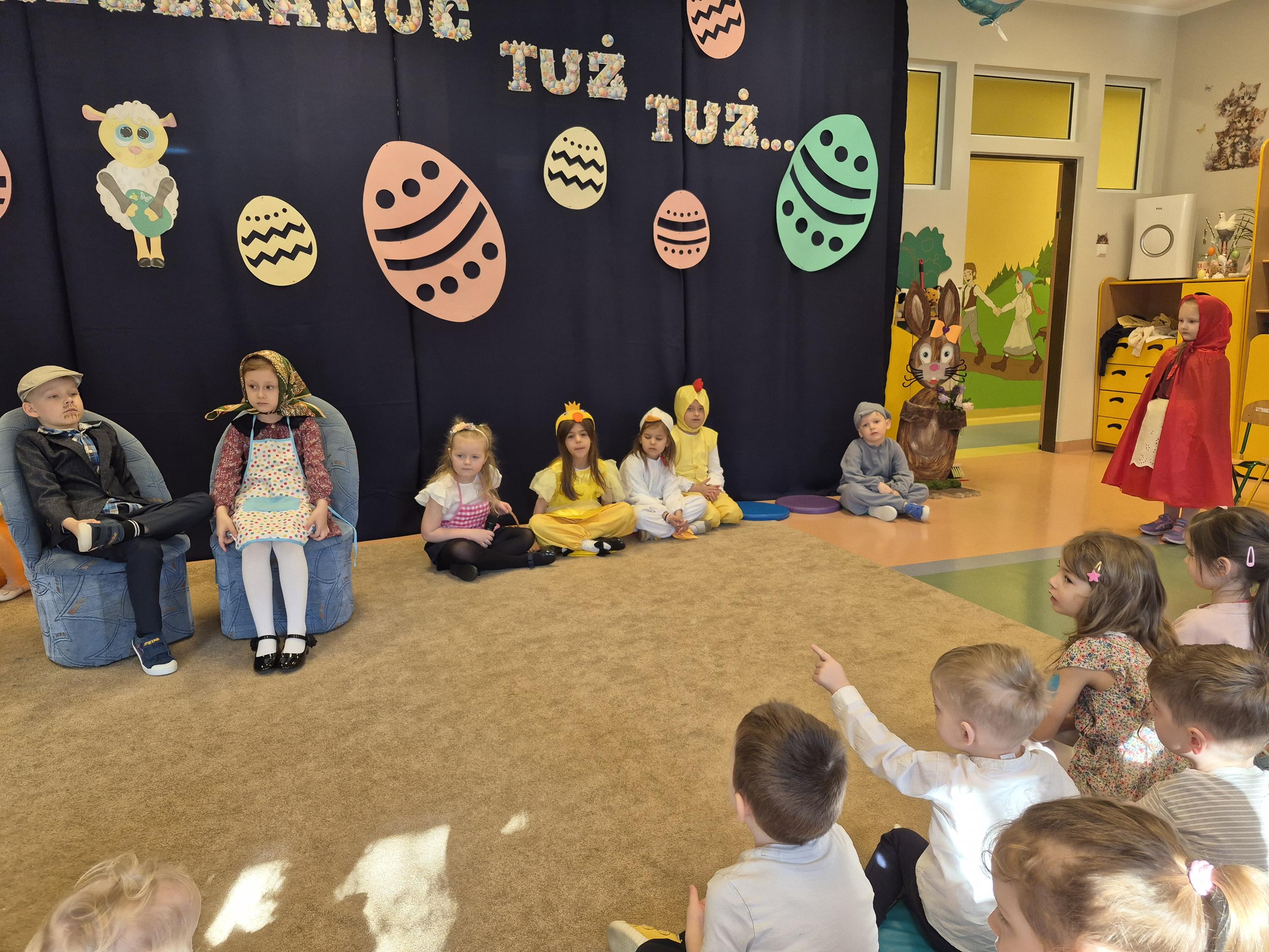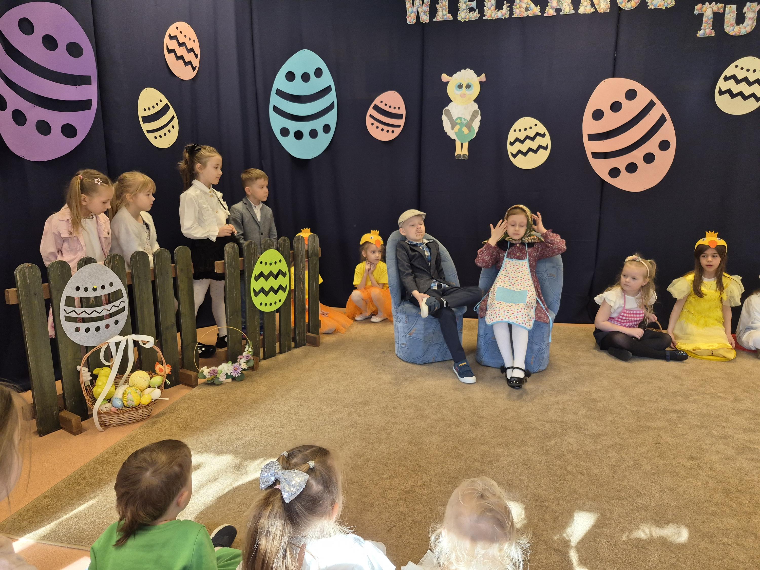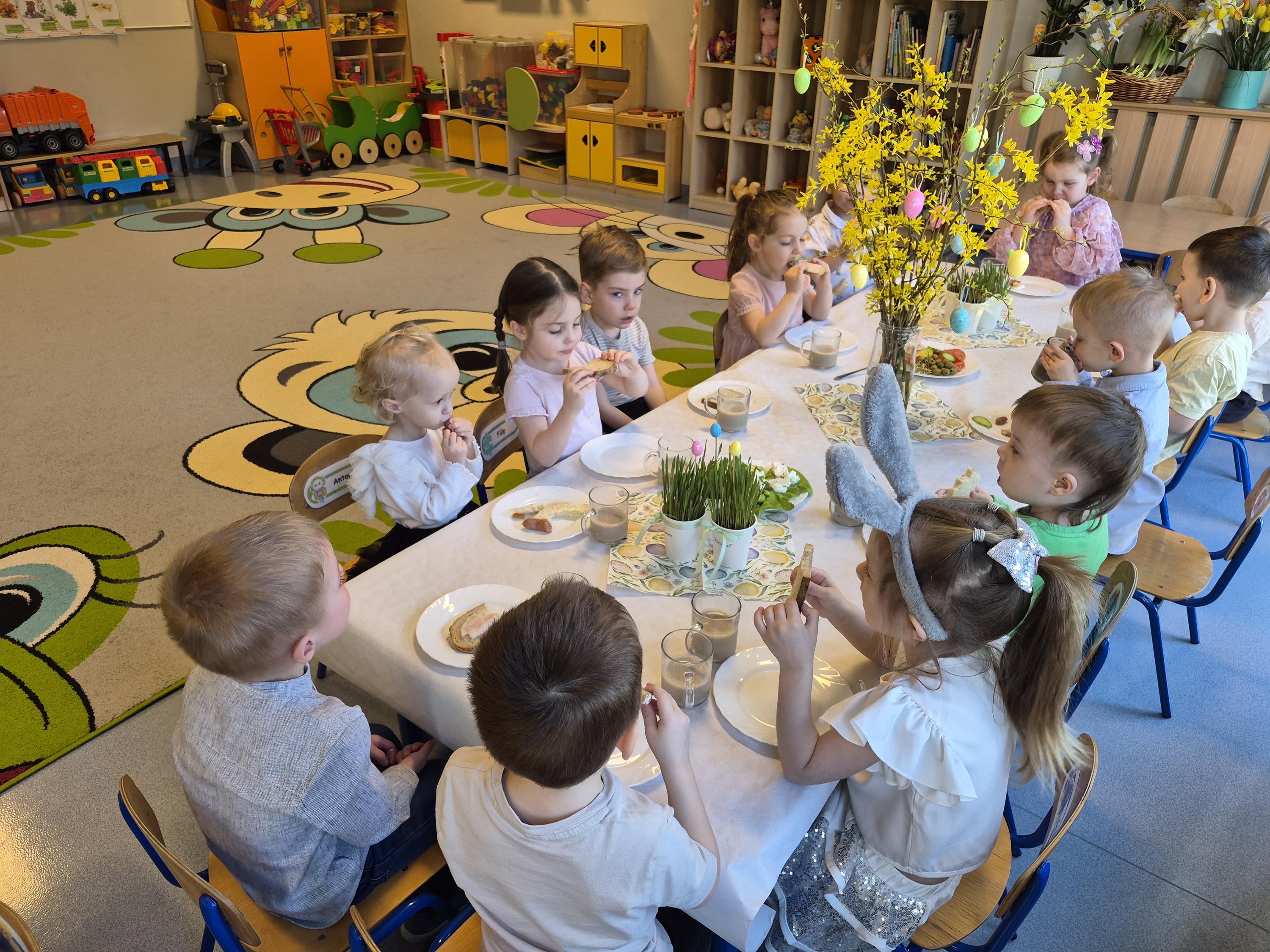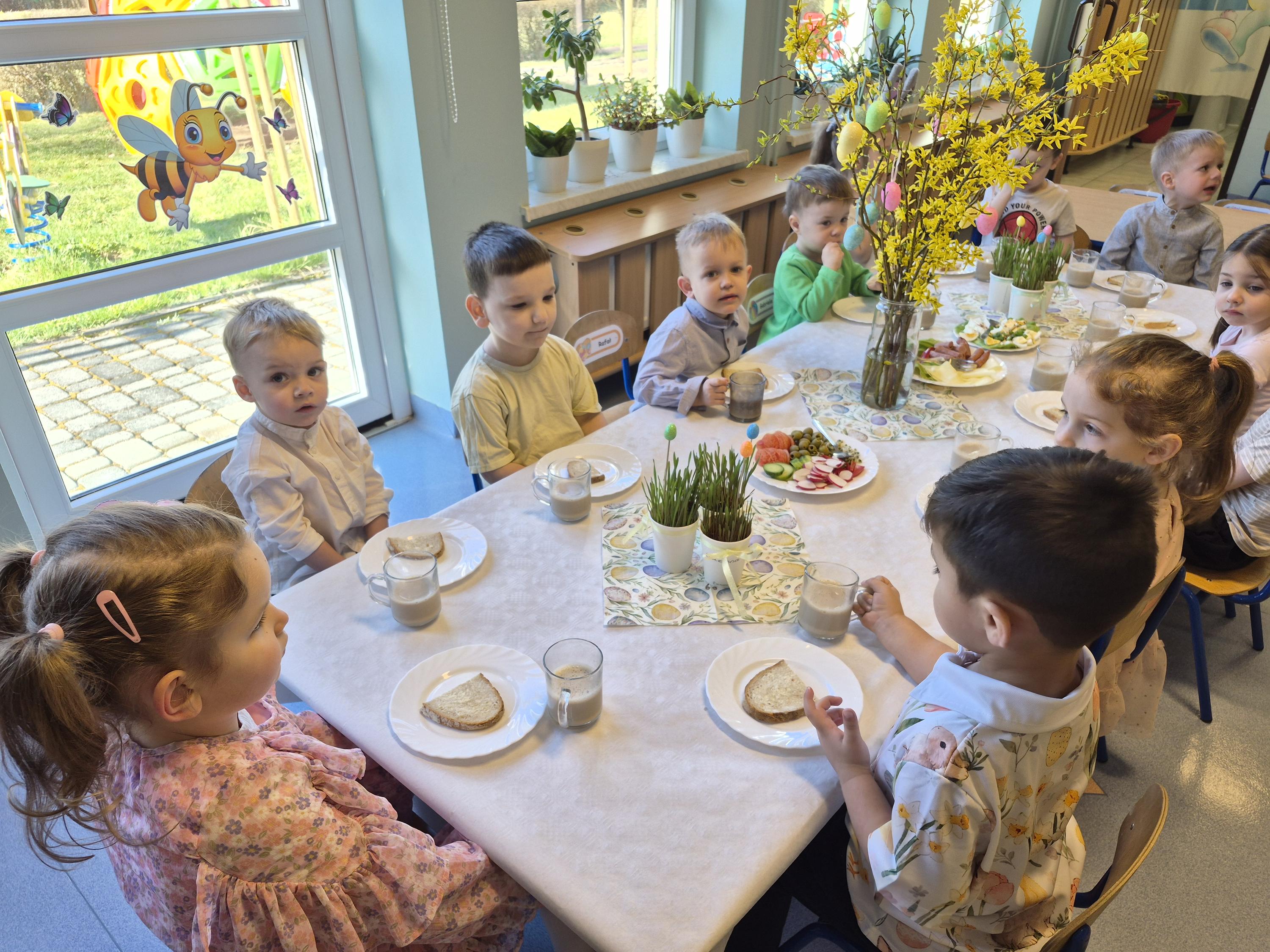 Śniadanie Wielkanocne w grupie „Krasnali” było bardzo uroczyste. Dzieci przyszły odświętnie ubrane i z wielką radością zasiadły do stołu. Na udekorowanych stołach były tradycyjne potrawy wielkanocne. Przed rozpoczęciem posiłku wszyscy złożyli sobie świąteczne życzenia. W trakcie śniadania panowała miła atmosfera, pełna uśmiechu i wspólnych rozmów. Po śniadaniu odbyło się przedstawienie wielkanocne w wykonaniu dzieci z kółka teatralnego.