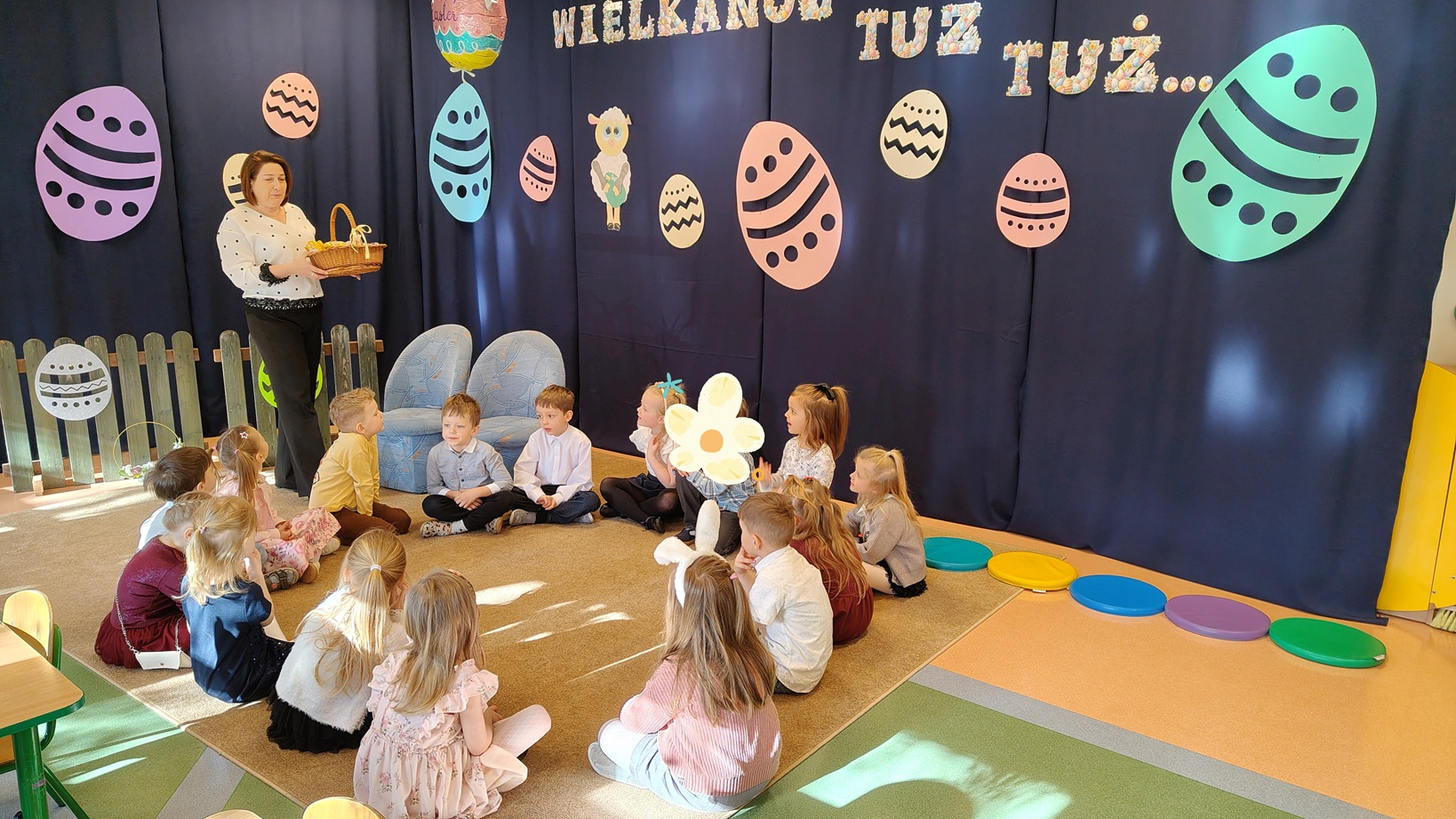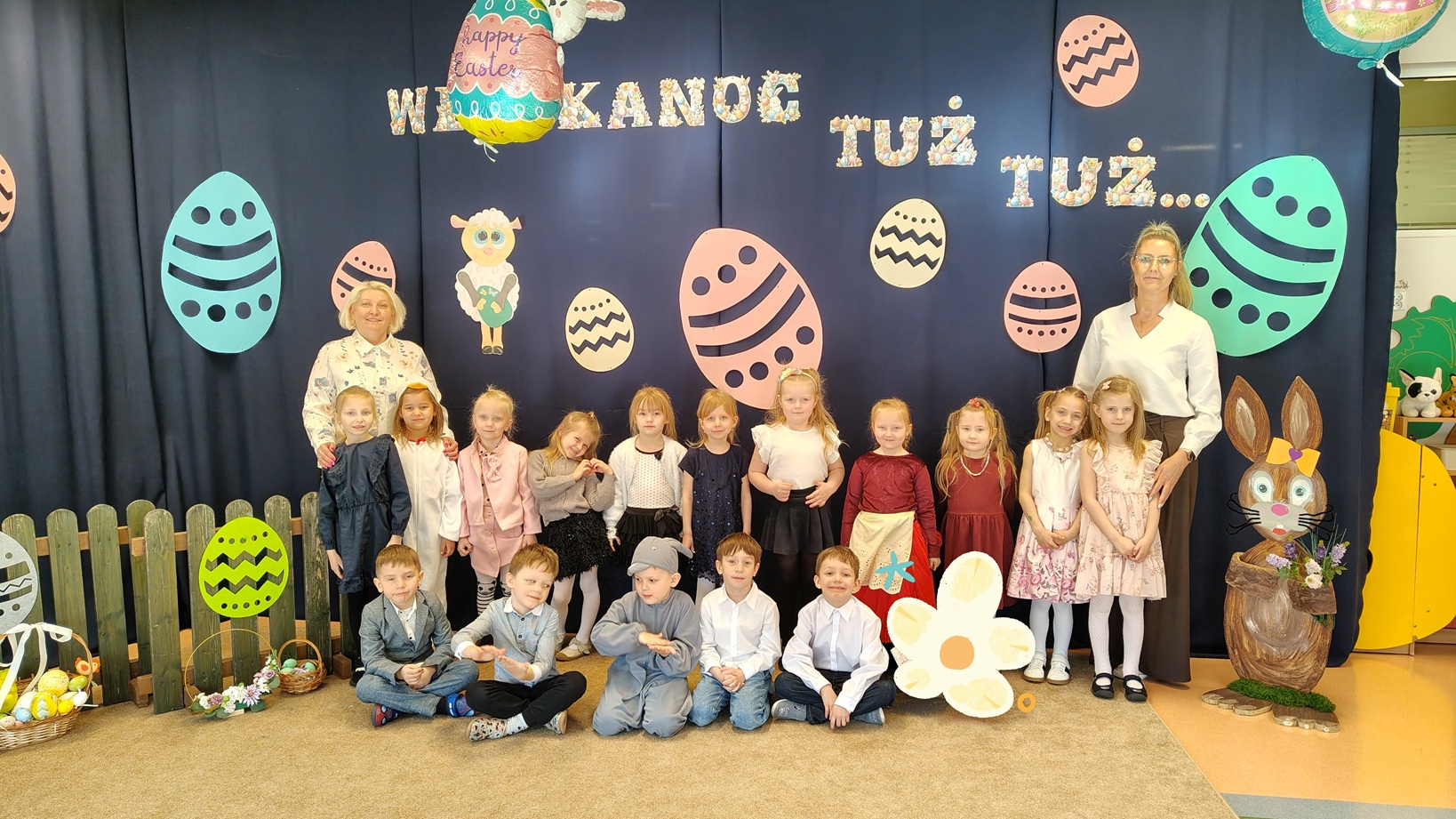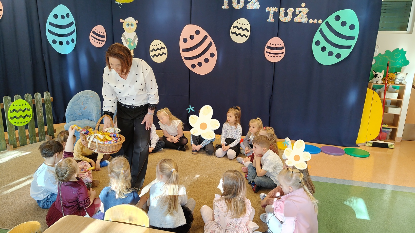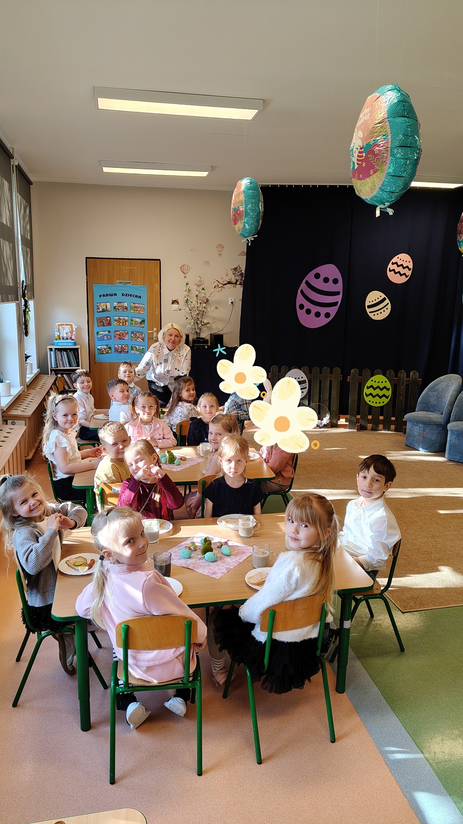 W naszej grupie w środę odbyło się uroczyste Śniadanie Wielkanocne . Dzieci przyszły odświętnie ubrane i z wielką radością zasiadły do stołu. Na udekorowanych stołach były tradycyjne potrawy wielkanocne. Przed rozpoczęciem posiłku wszyscy złożyli sobie świąteczne życzenia. W trakcie śniadania panowała miła atmosfera, pełna uśmiechu i wspólnych rozmów. Po śniadaniu na dzieci czekała miła niespodzianka odwiedziła nas Pani Dyrektor wszystkim dzieciom składając świąteczne życzenia i dla każdego miała słodką niespodzianką w postaci czekoladowych zajączków, oraz upominki od Rady Rodziców i Pań z grupy. Na zakończenie odbyło się przedstawienie wielkanocne w wykonaniu dzieci z kółka teatralnego.