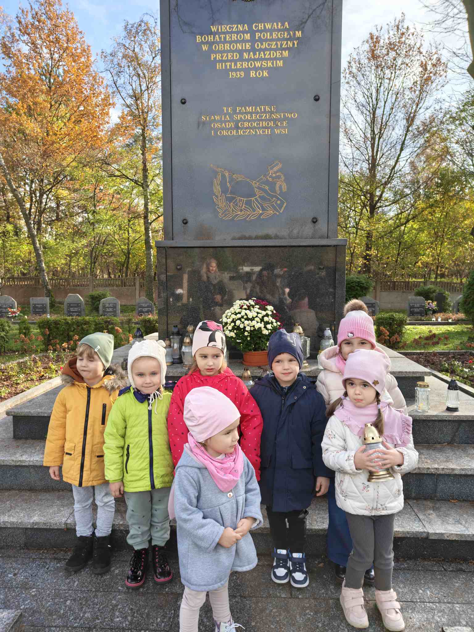 W ramach akcji edukacyjnej Ministerstwa Edukacji i Nauki "Szkoła pamięta", dzieci z naszego przedszkola odwiedziły pobliski cmentarz w Grocholicach, aby uczcić pamięć zmarłych i zapalić znicze na grobach zasłużonych osób, żołnierzy i bohaterów. Wizyta miała na celu uwrażliwienie na potrzebę pielęgnowania pamięci historycznej i lokalnej, a także nauczenie dzieci szacunku dla zmarłych i odpowiednich zachowań w miejscach pamięci.