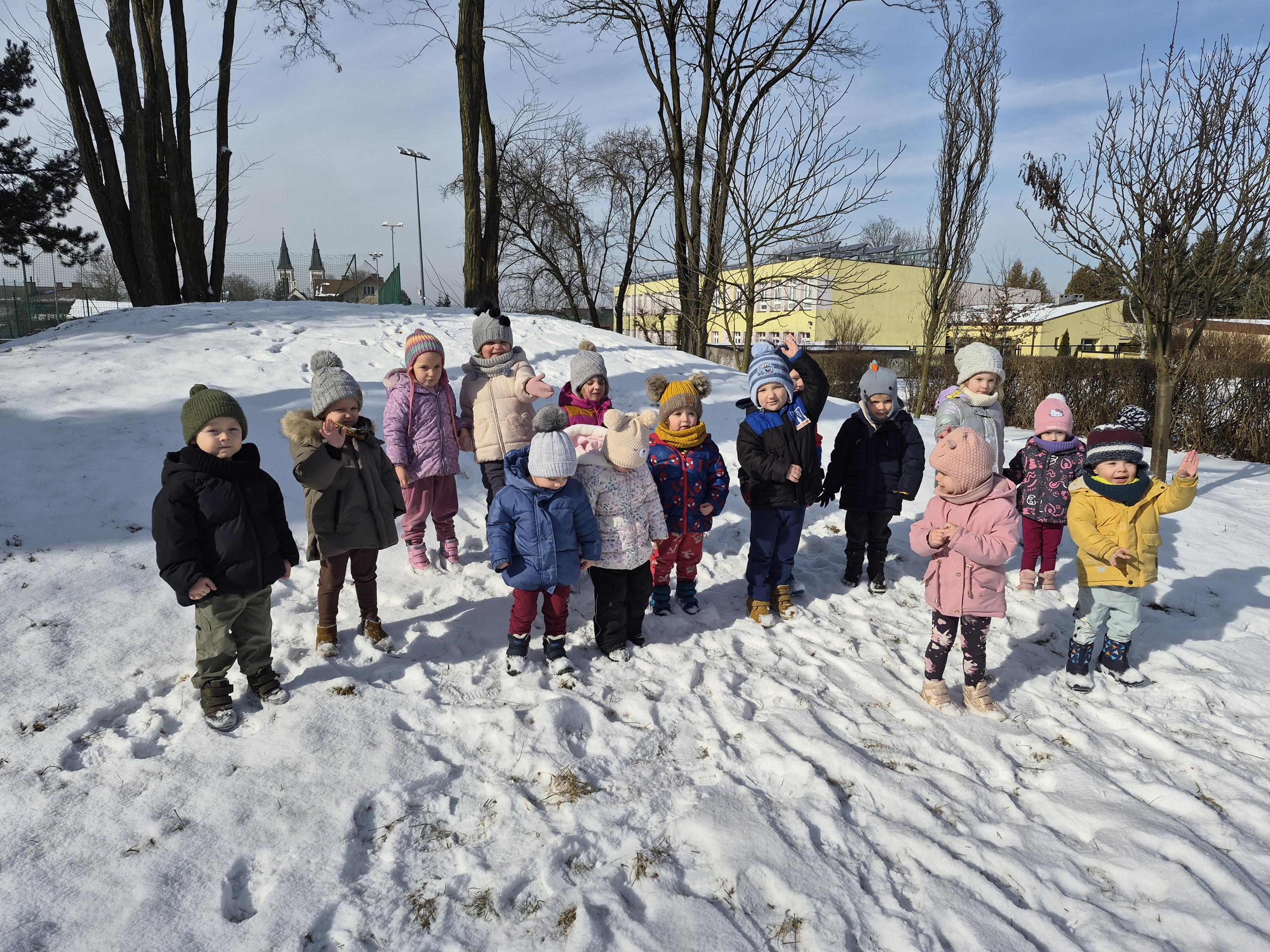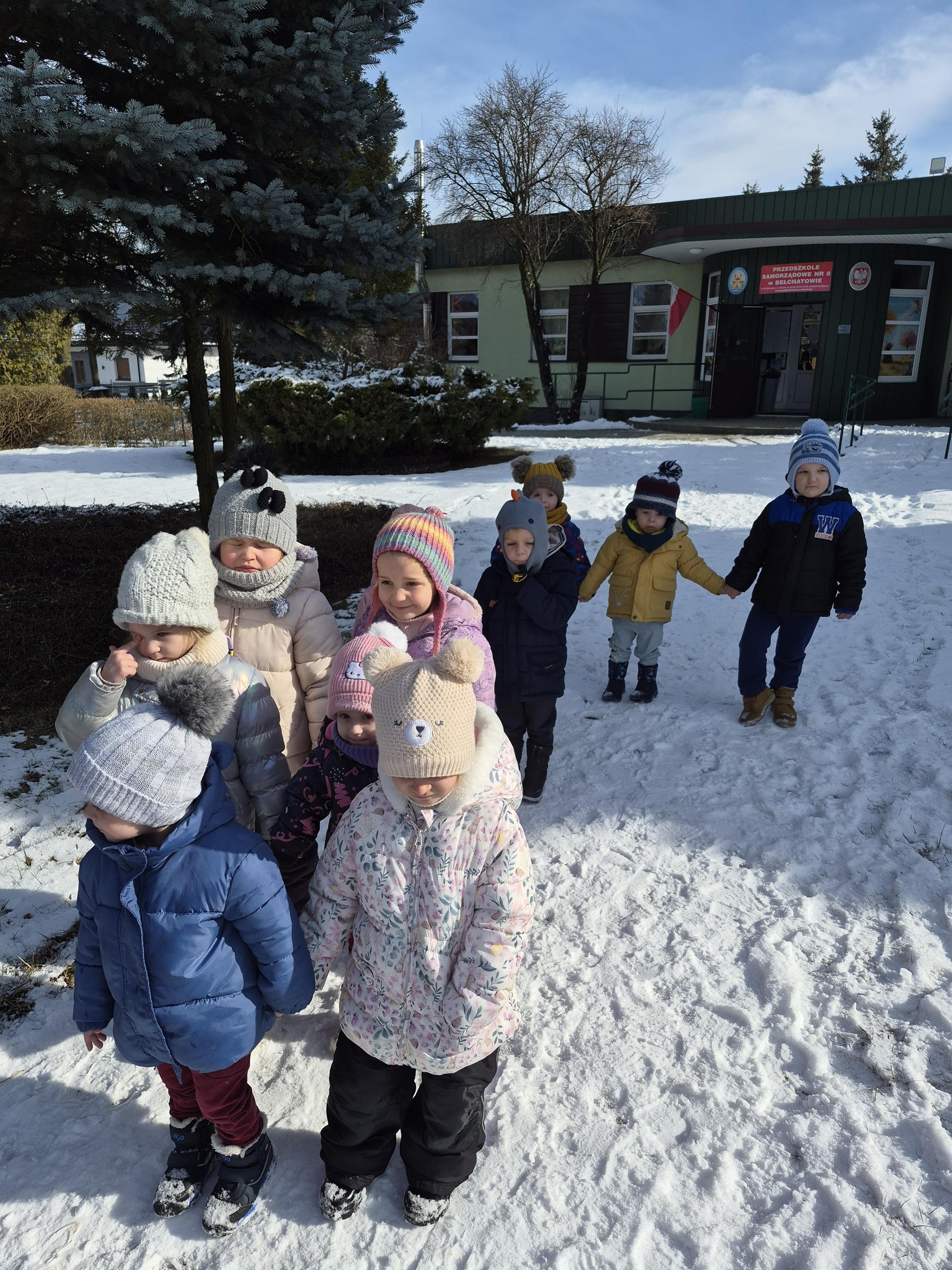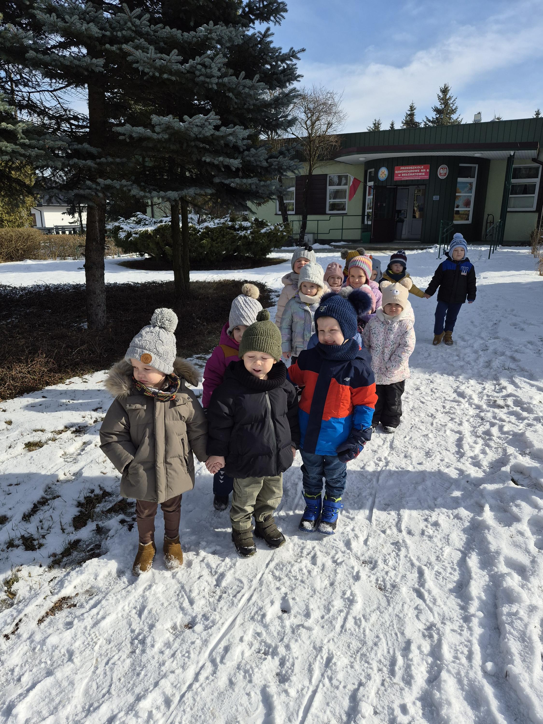 Grupa „Krasnale” wybrała się na zimowy spacer po ogrodzie przedszkolnym, aby podziwiać piękno zimowej przyrody. Dzieci obserwowały drzewa pokryte białym puchem oraz szukały śladów pozostawionych na śniegu. Rozmawialiśmy o tym, jak należy ubierać się zimą i dlaczego ciepła czapka, szalik oraz rękawiczki są tak ważne. Nie zabrakło także radosnych zabaw na śniegu. To był czas pełen świeżego powietrza, uśmiechu i wspólnego odkrywania zimowych uroków ogrodu.