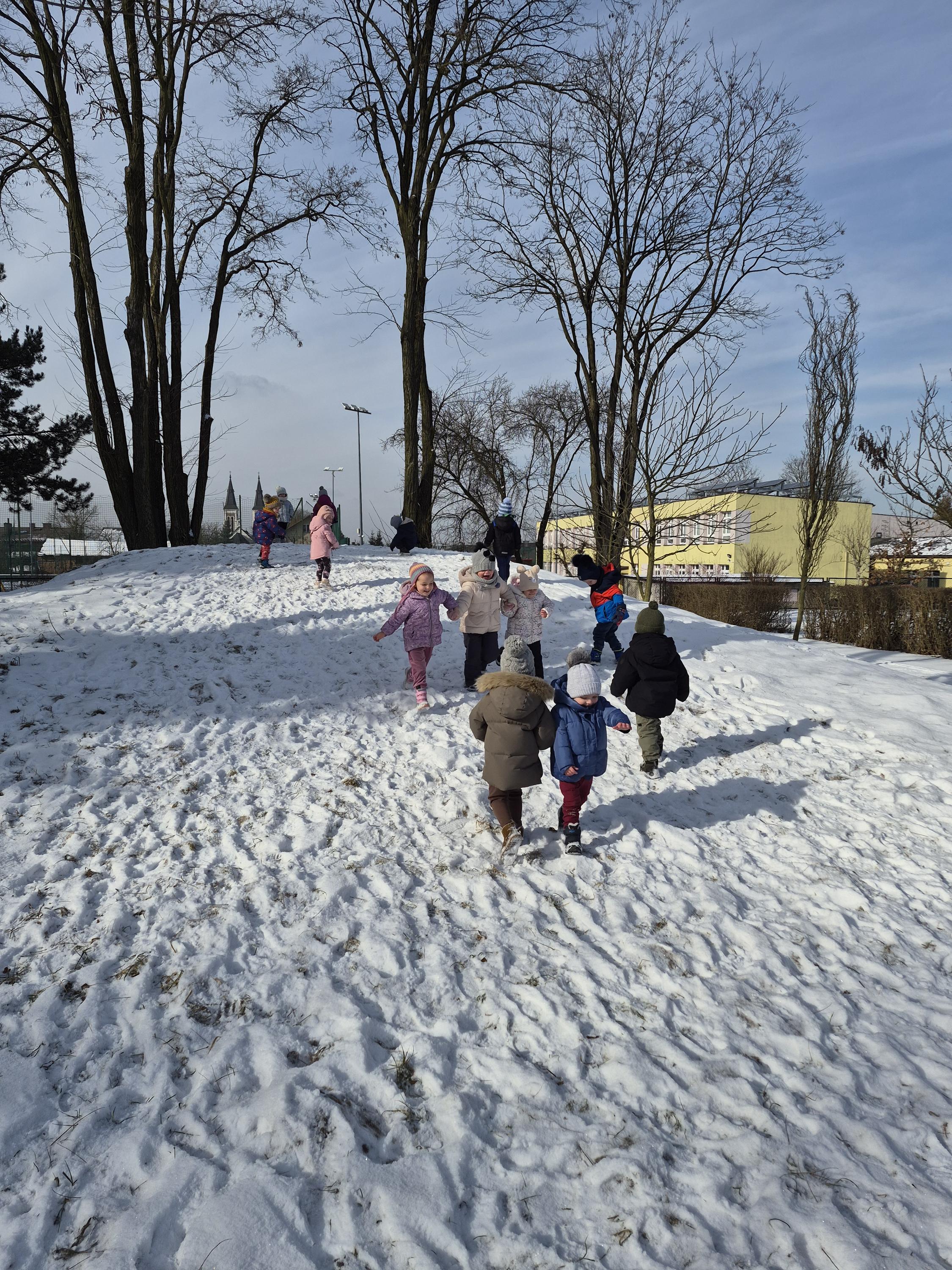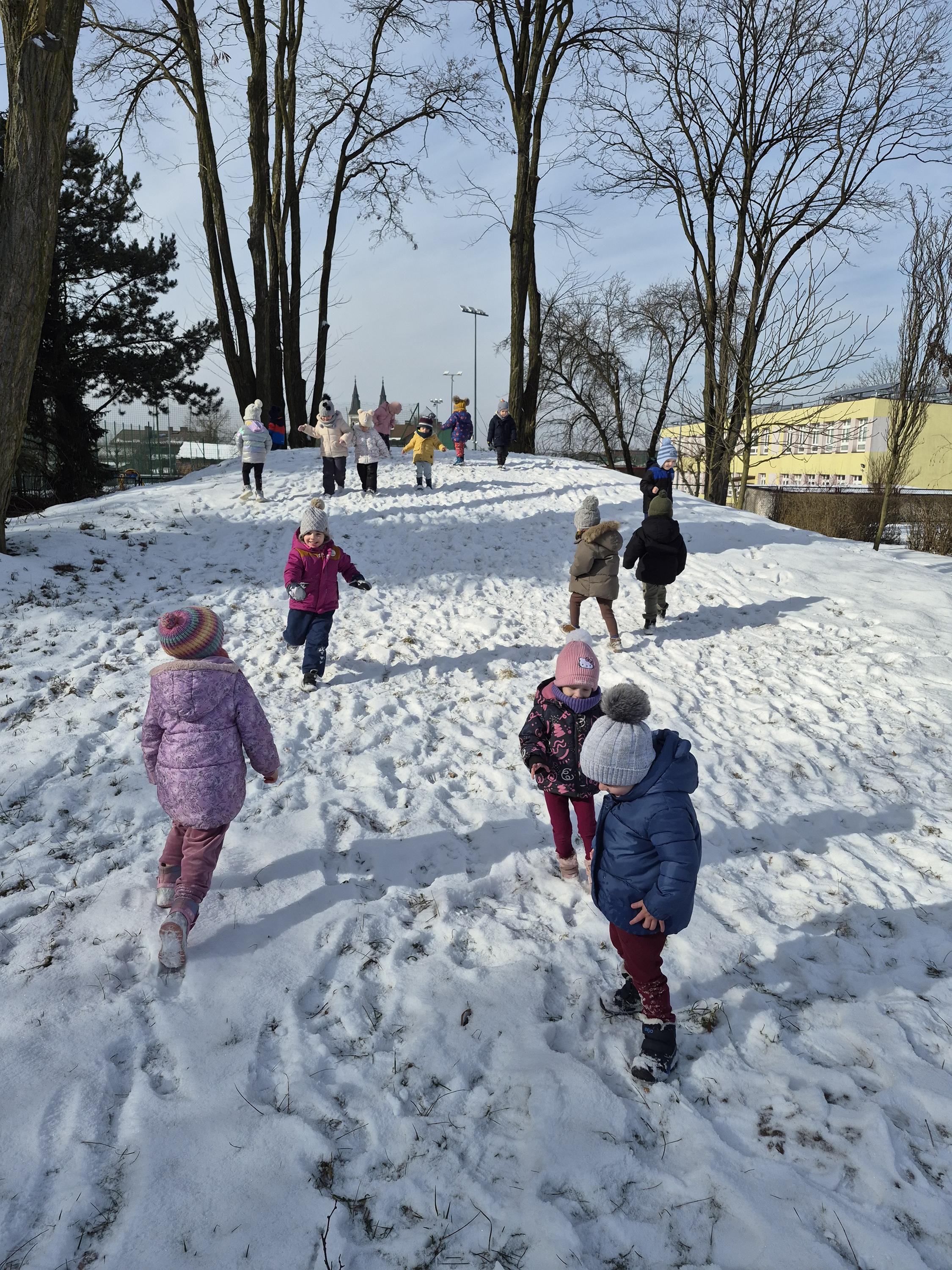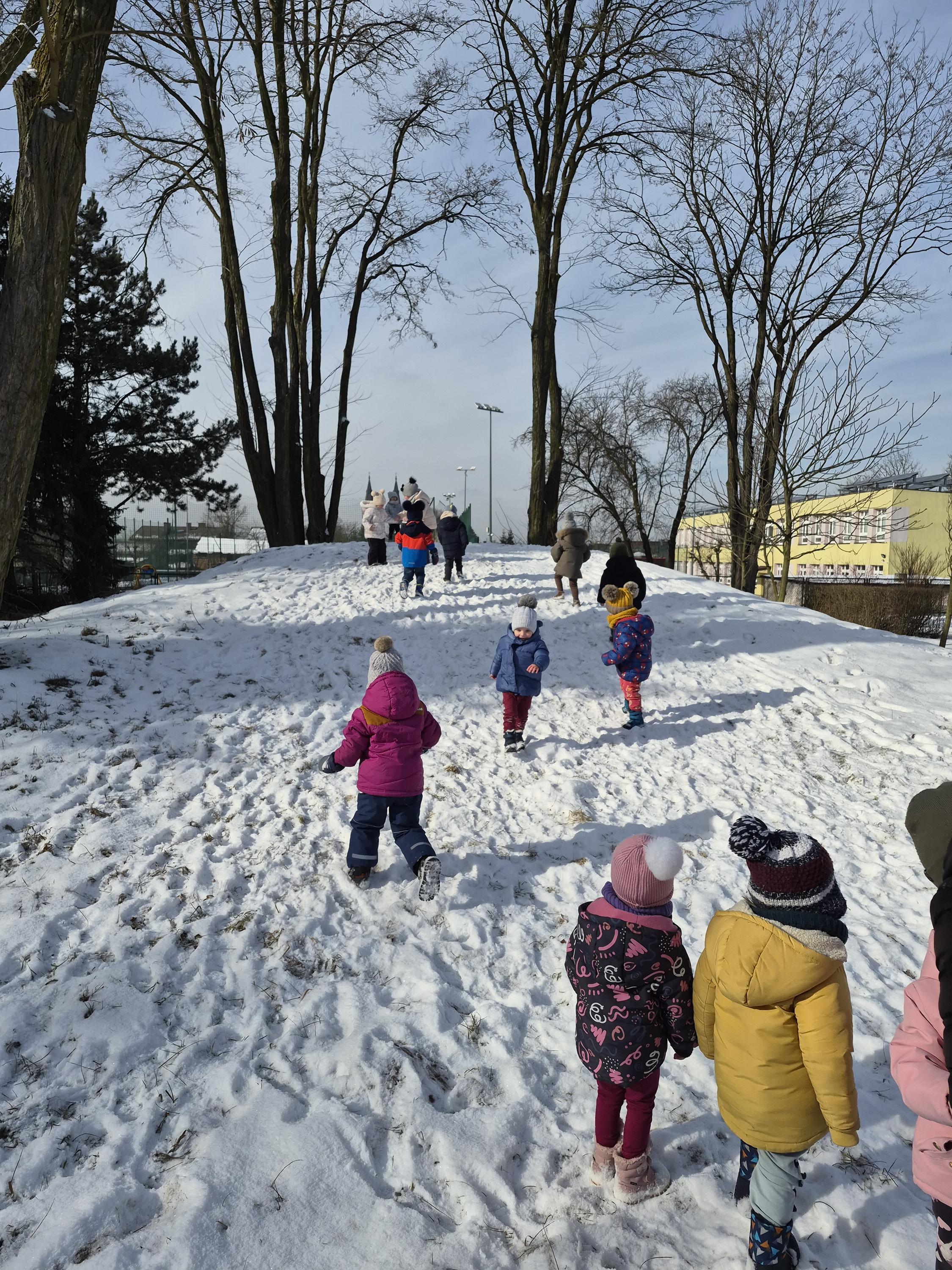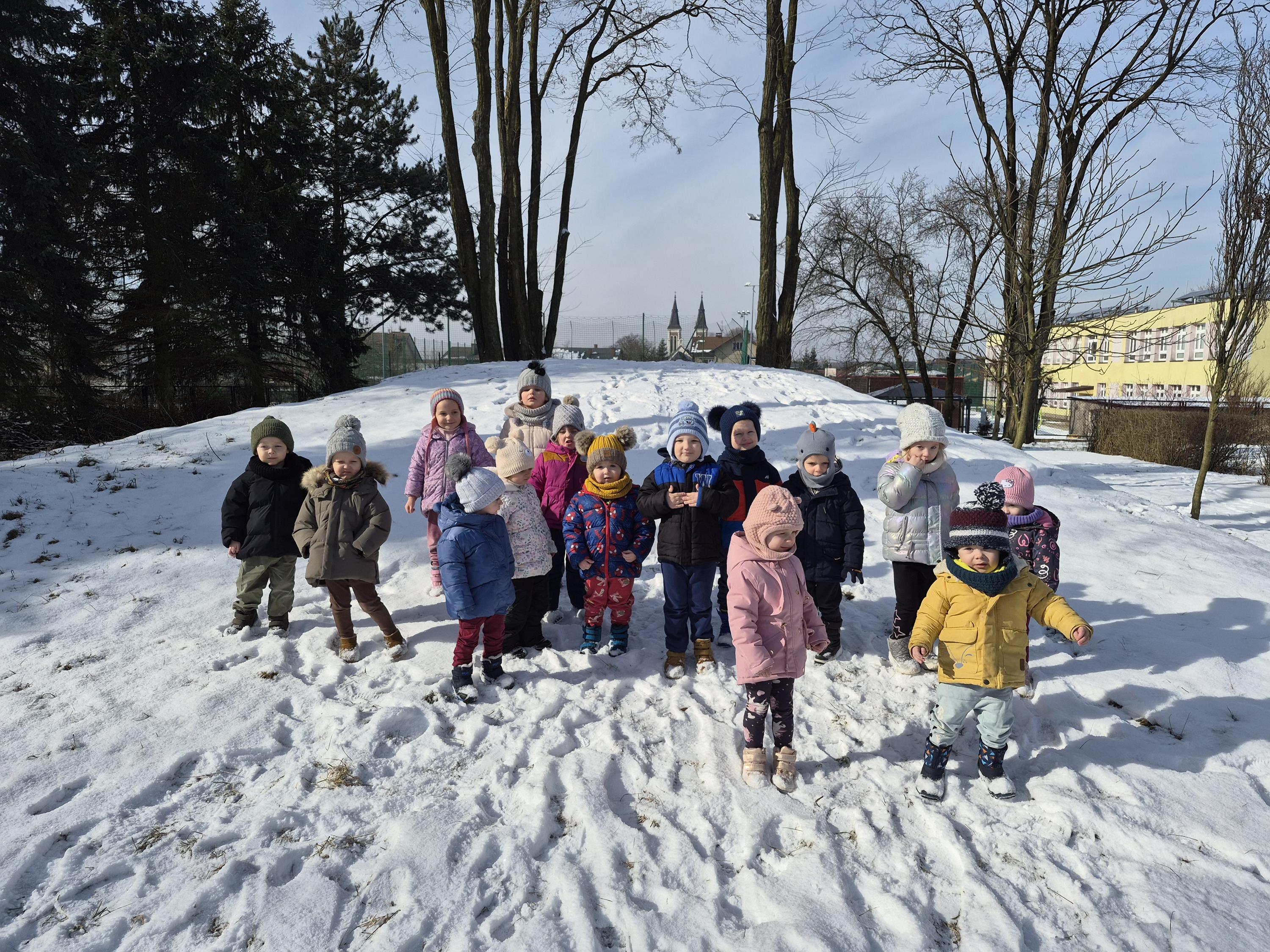 Grupa „Krasnale” wybrała się na zimowy spacer po ogrodzie przedszkolnym, aby podziwiać piękno zimowej przyrody. Dzieci obserwowały drzewa pokryte białym puchem oraz szukały śladów pozostawionych na śniegu. Rozmawialiśmy o tym, jak należy ubierać się zimą i dlaczego ciepła czapka, szalik oraz rękawiczki są tak ważne. Nie zabrakło także radosnych zabaw na śniegu. To był czas pełen świeżego powietrza, uśmiechu i wspólnego odkrywania zimowych uroków ogrodu.