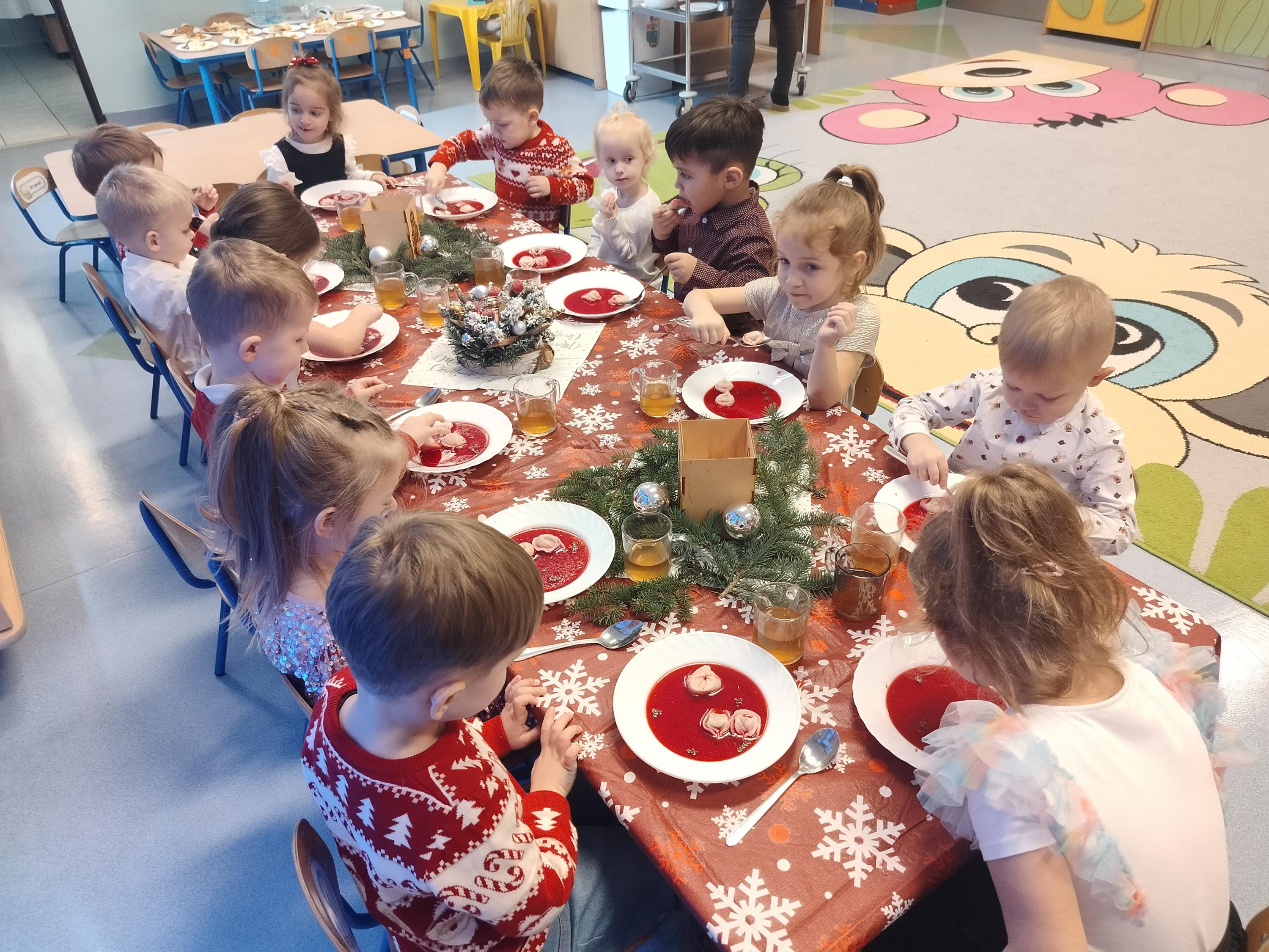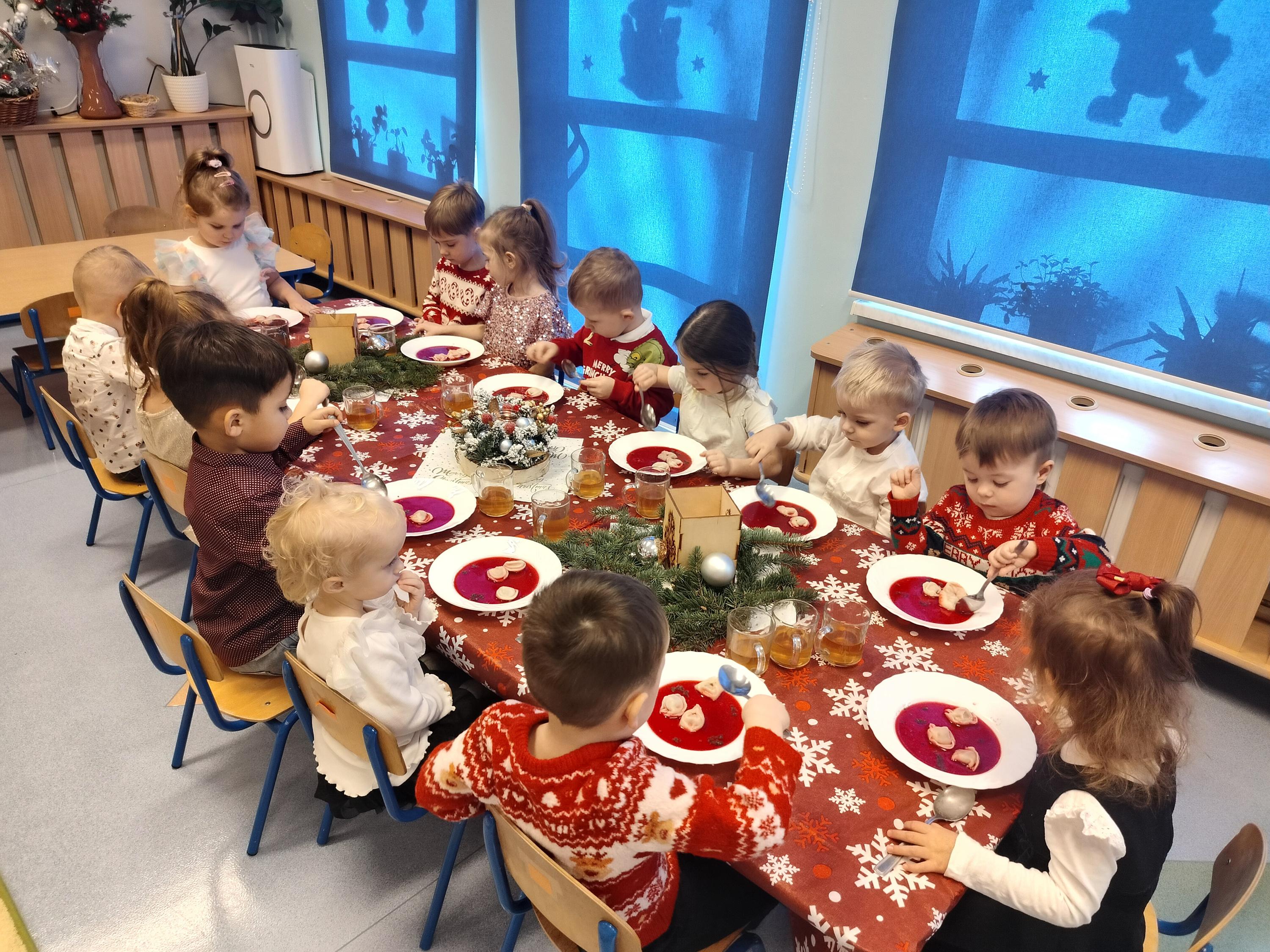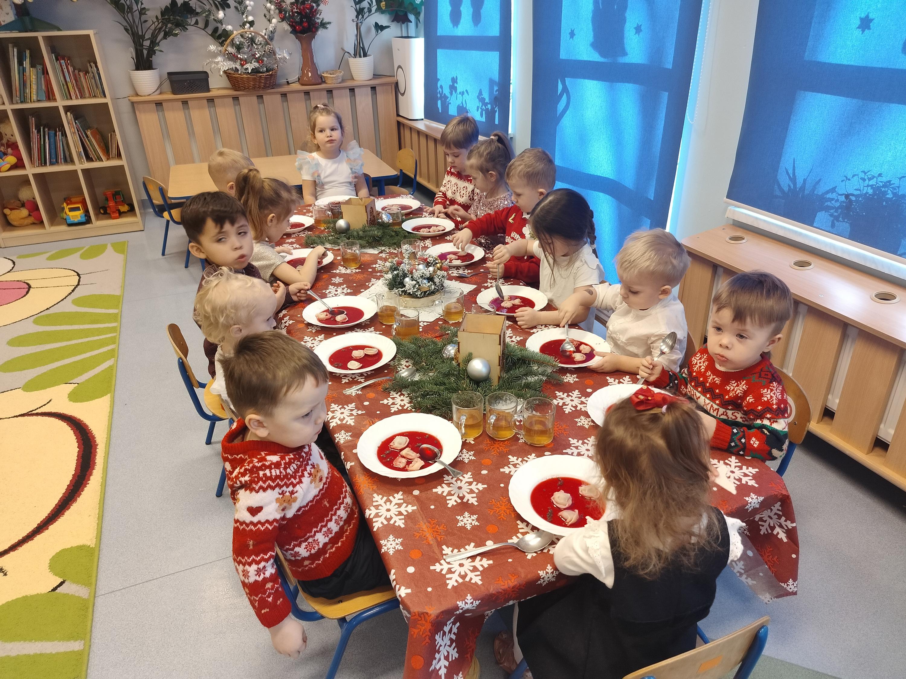 W piątek, 19 grudnia, w naszym przedszkolu panowała wyjątkowa, świąteczna atmosfera. Dzieci uczestniczyły w uroczystym obiedzie wigilijnym, podczas którego nie zabrakło pięknie udekorowanych stołów, wspólnego posiłku oraz dzielenia się opłatkiem. Był to czas pełen radości, serdeczności i wzajemnej życzliwości. Wspólne przeżywanie tych chwil pozwoliło dzieciom poznać i kultywować piękne bożonarodzeniowe tradycje oraz budować poczucie wspólnoty w naszej przedszkolnej grupie.