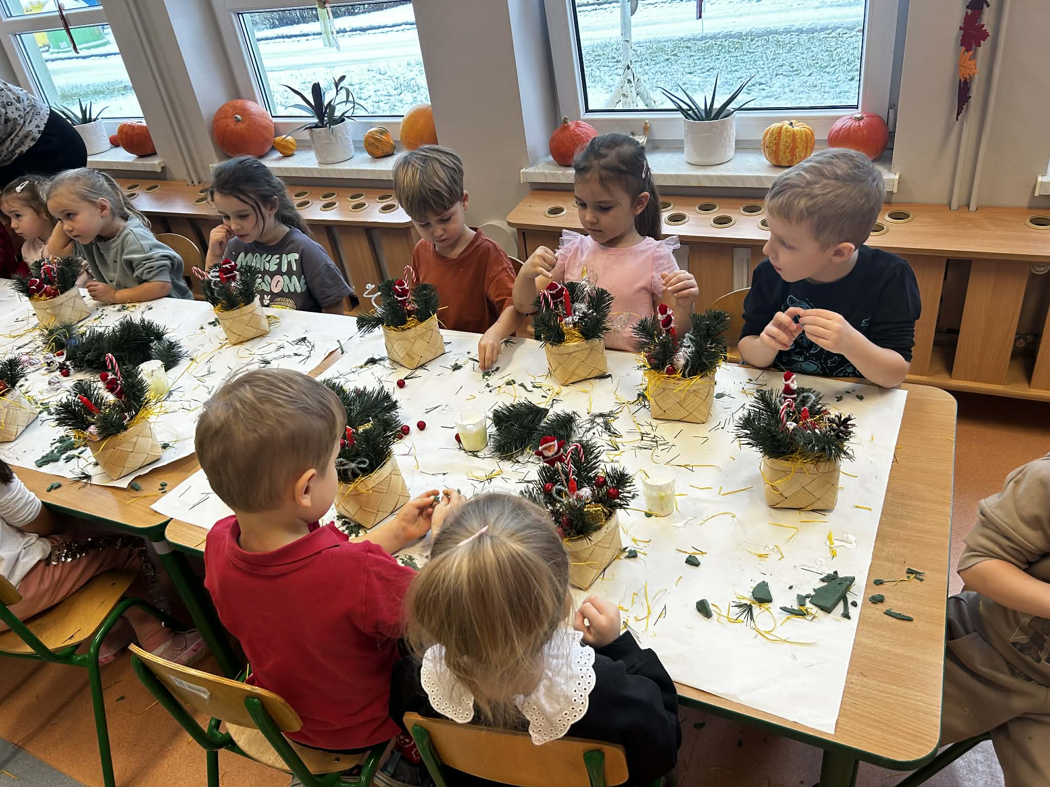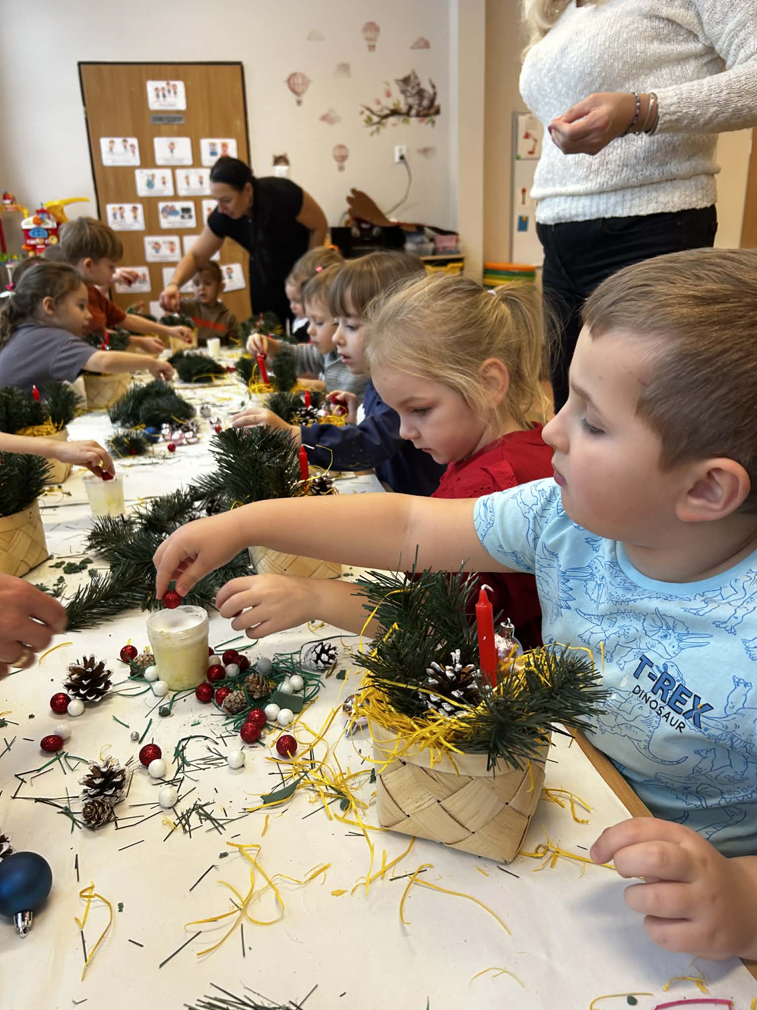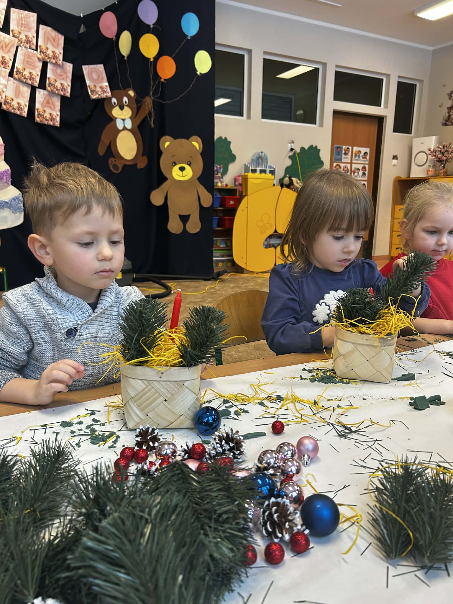 Podczas świątecznych warsztatów grupa Misie z ogromnym zaangażowaniem tworzyła stroiki bożonarodzeniowe. Dzieci miały okazję rozwijać swoją kreatywność i sprawność manualną, a także ćwiczyć współpracę i samodzielność. Wykorzystując różnorodne materiały plastyczne i elementy dekoracyjne, przedszkolaki wprowadzały się w radosny, świąteczny nastrój. Warsztaty były pełne uśmiechu, twórczej zabawy i stanowiły piękne wprowadzenie w atmosferę nadchodzących Świąt Bożego Narodzenia.