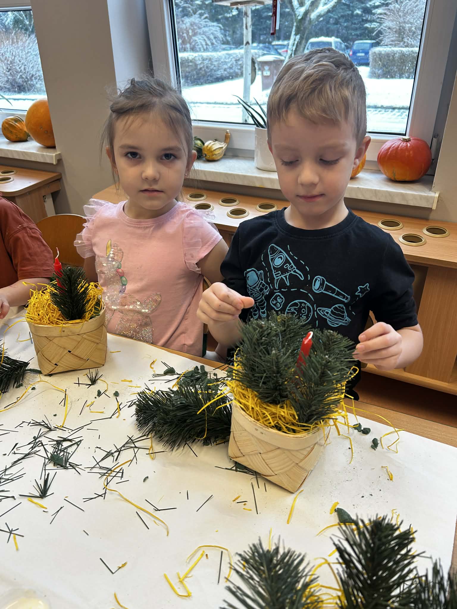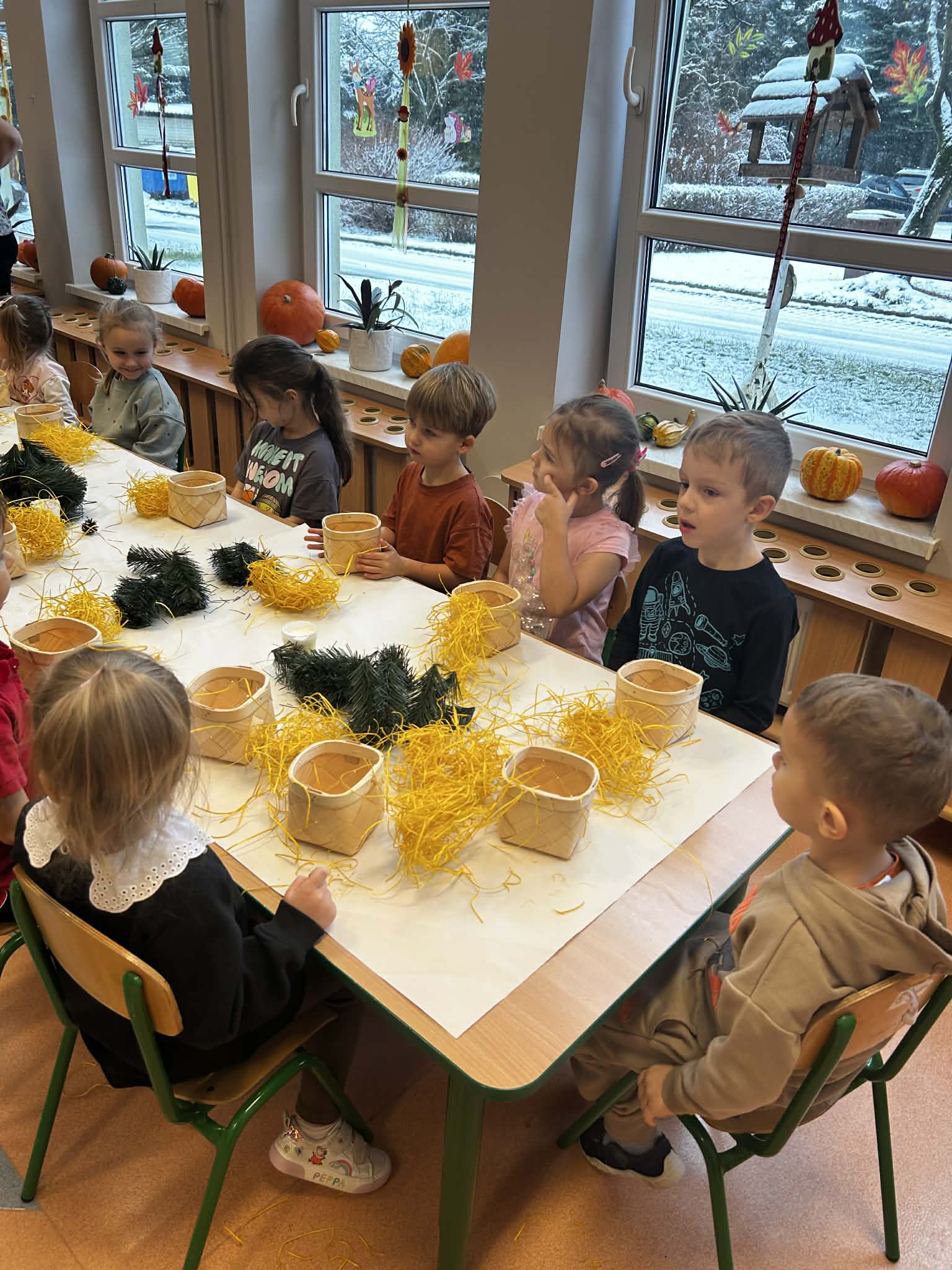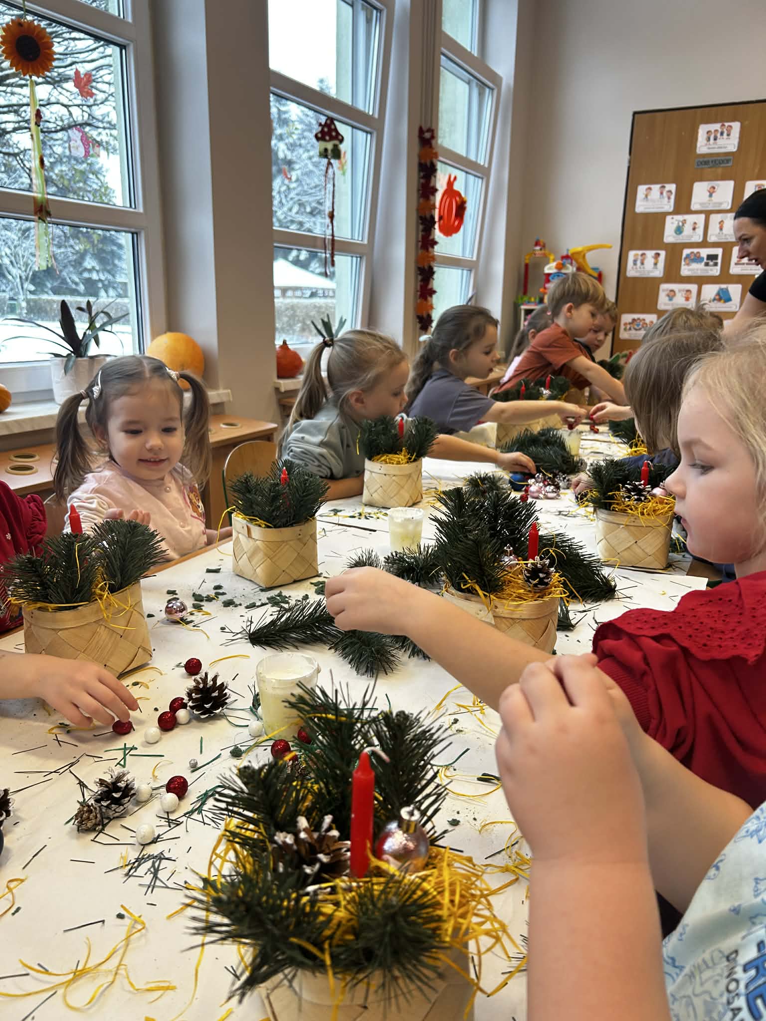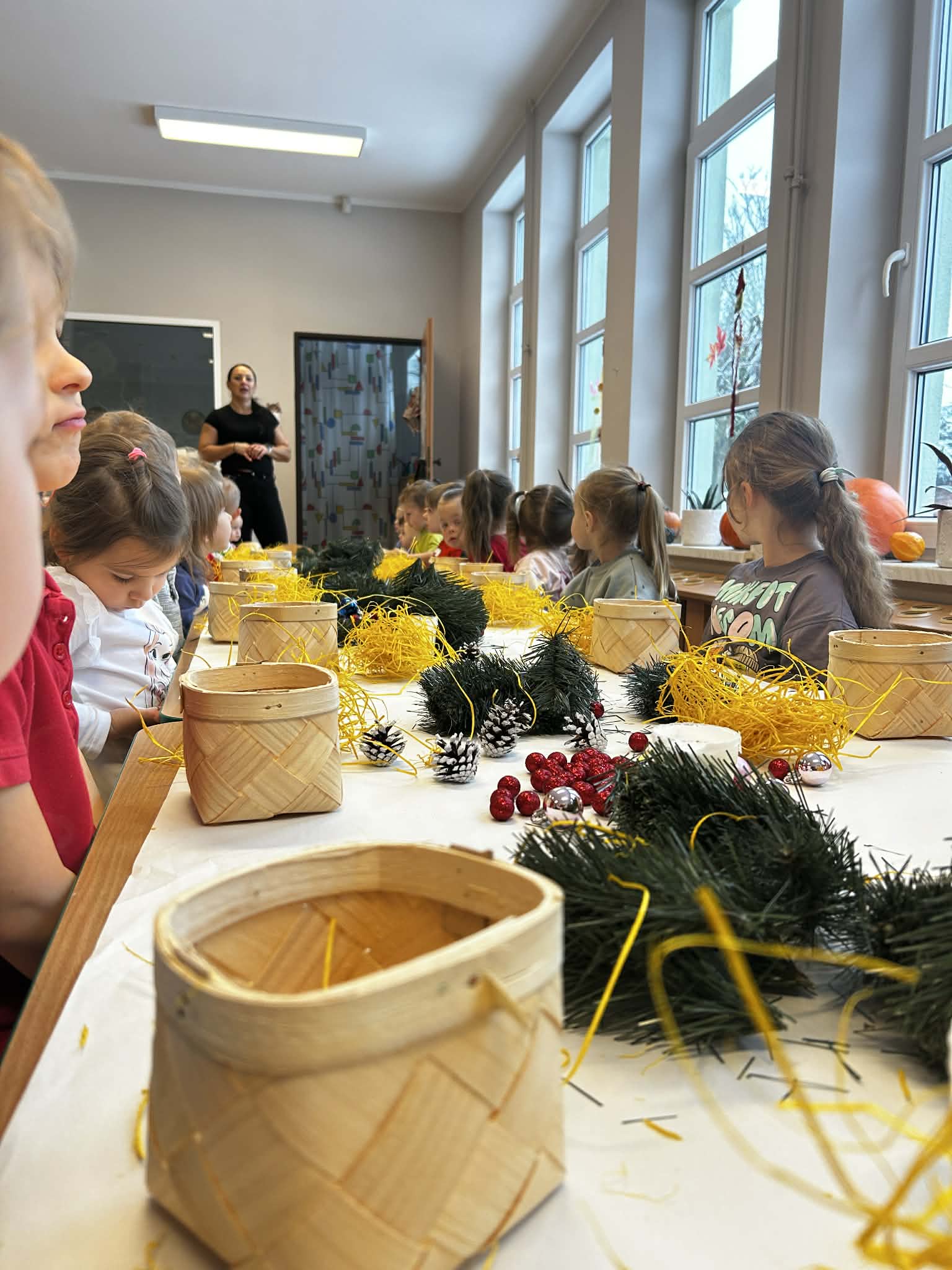 Podczas świątecznych warsztatów grupa Misie z ogromnym zaangażowaniem tworzyła stroiki bożonarodzeniowe. Dzieci miały okazję rozwijać swoją kreatywność i sprawność manualną, a także ćwiczyć współpracę i samodzielność. Wykorzystując różnorodne materiały plastyczne i elementy dekoracyjne, przedszkolaki wprowadzały się w radosny, świąteczny nastrój. Warsztaty były pełne uśmiechu, twórczej zabawy i stanowiły piękne wprowadzenie w atmosferę nadchodzących Świąt Bożego Narodzenia.
