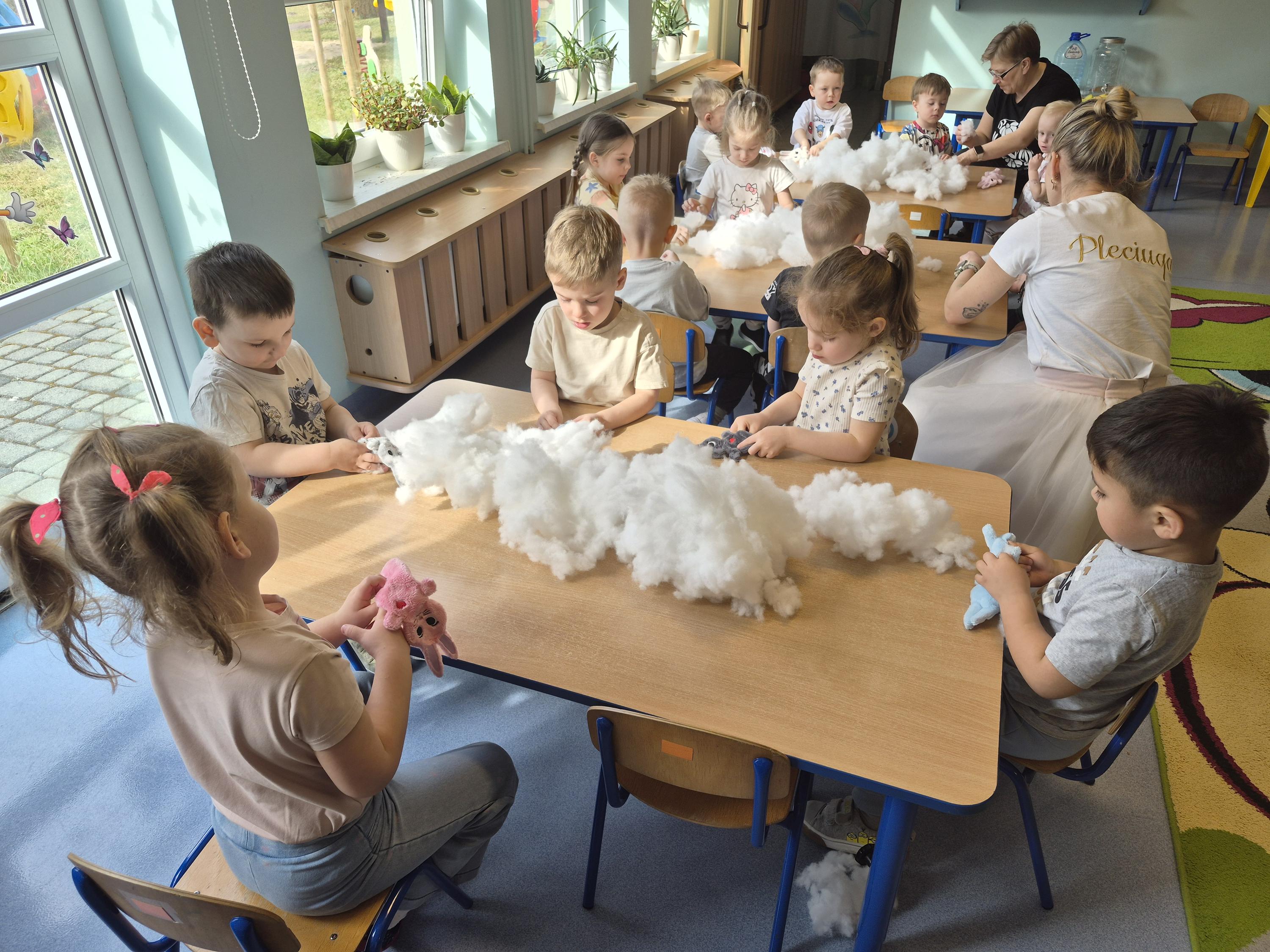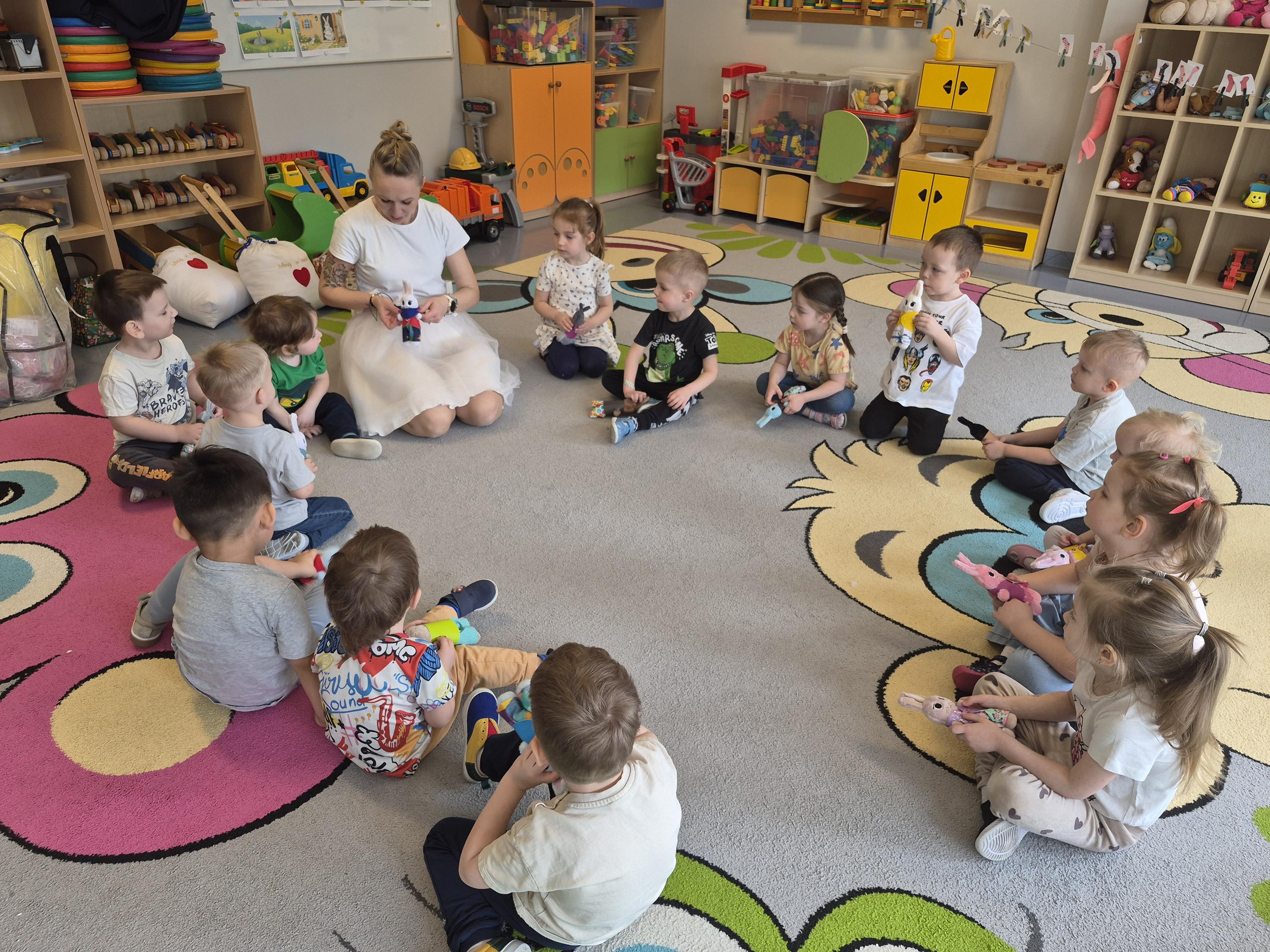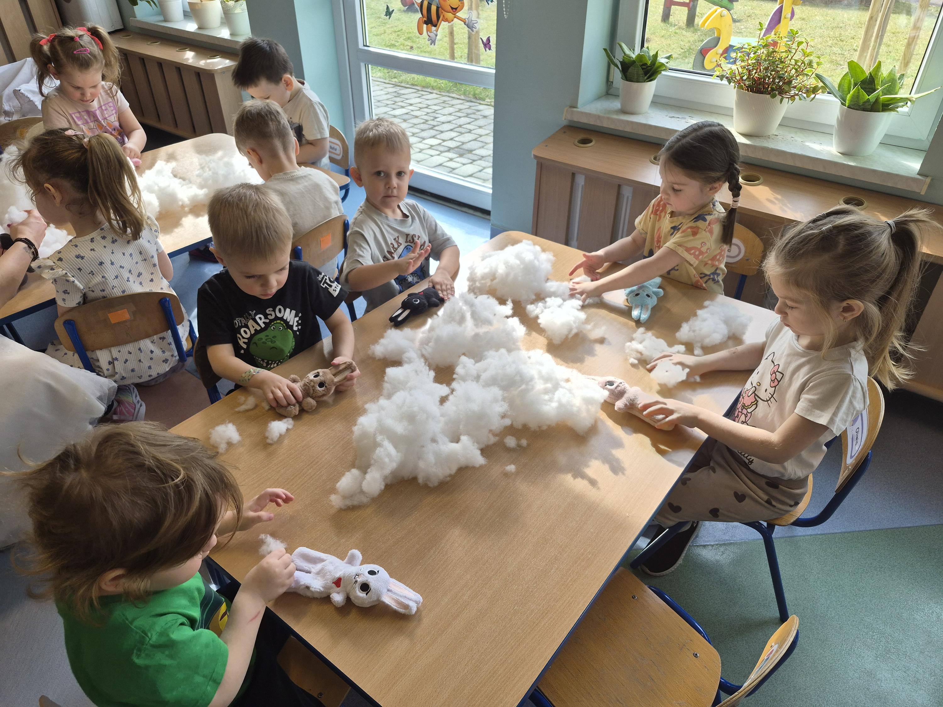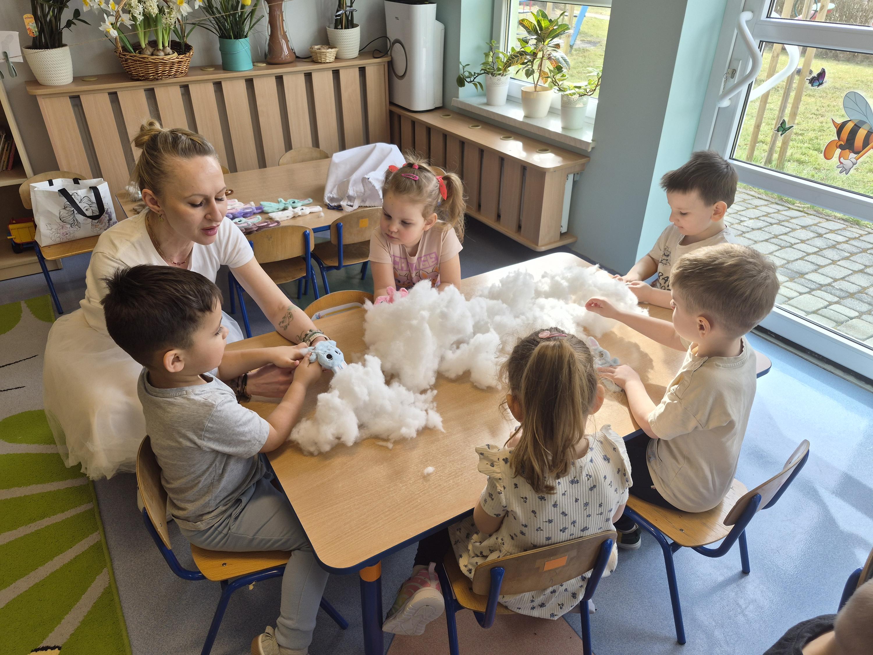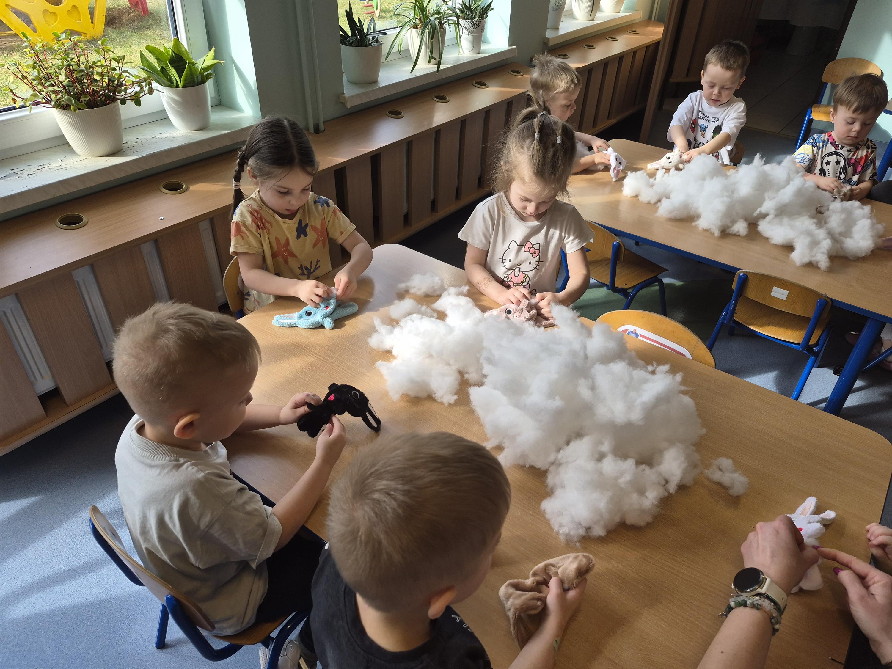 20 marca w naszym przedszkolu odbyły się wielkanocne warsztaty z udziałem cioci Pleciugi. Dzieci z dużym zaangażowaniem wypełniały watką wcześniej uszyte zajączki, ucząc się przy tym precyzji i cierpliwości. Każdy uczestnik mógł samodzielnie zdecydować, jak miękki i puszysty będzie jego zajączek. Następnie przyszedł czas na wybór ubranek, co sprawiło dzieciom wiele radości i pobudziło ich wyobraźnię. Powstały niezwykle kolorowe i oryginalne prace, które odzwierciedlały indywidualne pomysły małych twórców. Warsztaty przebiegły w ciepłej i twórczej atmosferze, a dzieci były bardzo dumne ze swoich zajączków.