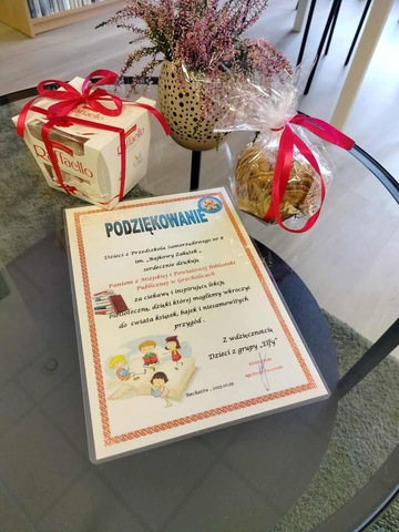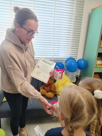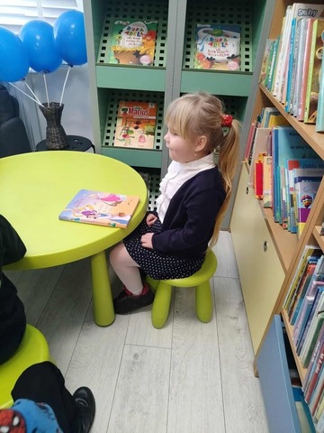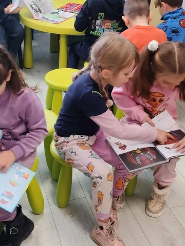 Dzieci z dużą ciekawością zwiedzały nowoczesne, kolorowe wnętrza biblioteki oraz poznawały różnorodne działy z książkami dla najmłodszych. Pani bibliotekarka opowiedziała przedszkolakom o zasadach wypożyczania książek, pokazała, jak dbać o książki oraz jak szukać interesujących pozycji na półkach. Podczas wizyty dzieci wysłuchały także krótkiego opowiadania, które wzbudziło ich zainteresowanie i wywołało wiele pozytywnych emocji. Na zakończenie spotkania każdy przedszkolak mógł samodzielnie obejrzeć wybrane książeczki, co sprawiło im ogromną radość. Wizyta w bibliotece była dla naszej grupy niezwykle wartościowym doświadczeniem. Dzieci nie tylko miło spędziły czas, ale również zostały zachęcone do częstszego kontaktu z literaturą i rozwijania zainteresowań czytelniczych.