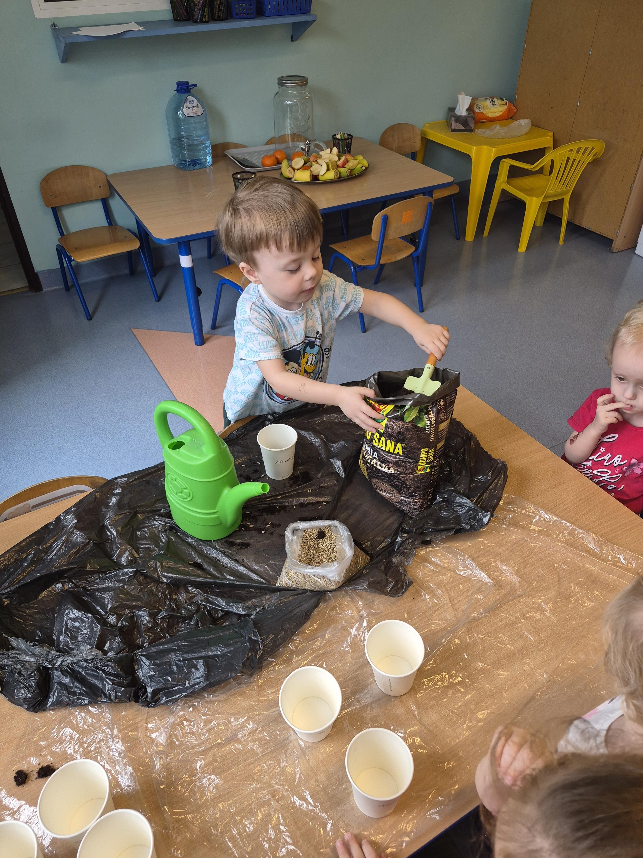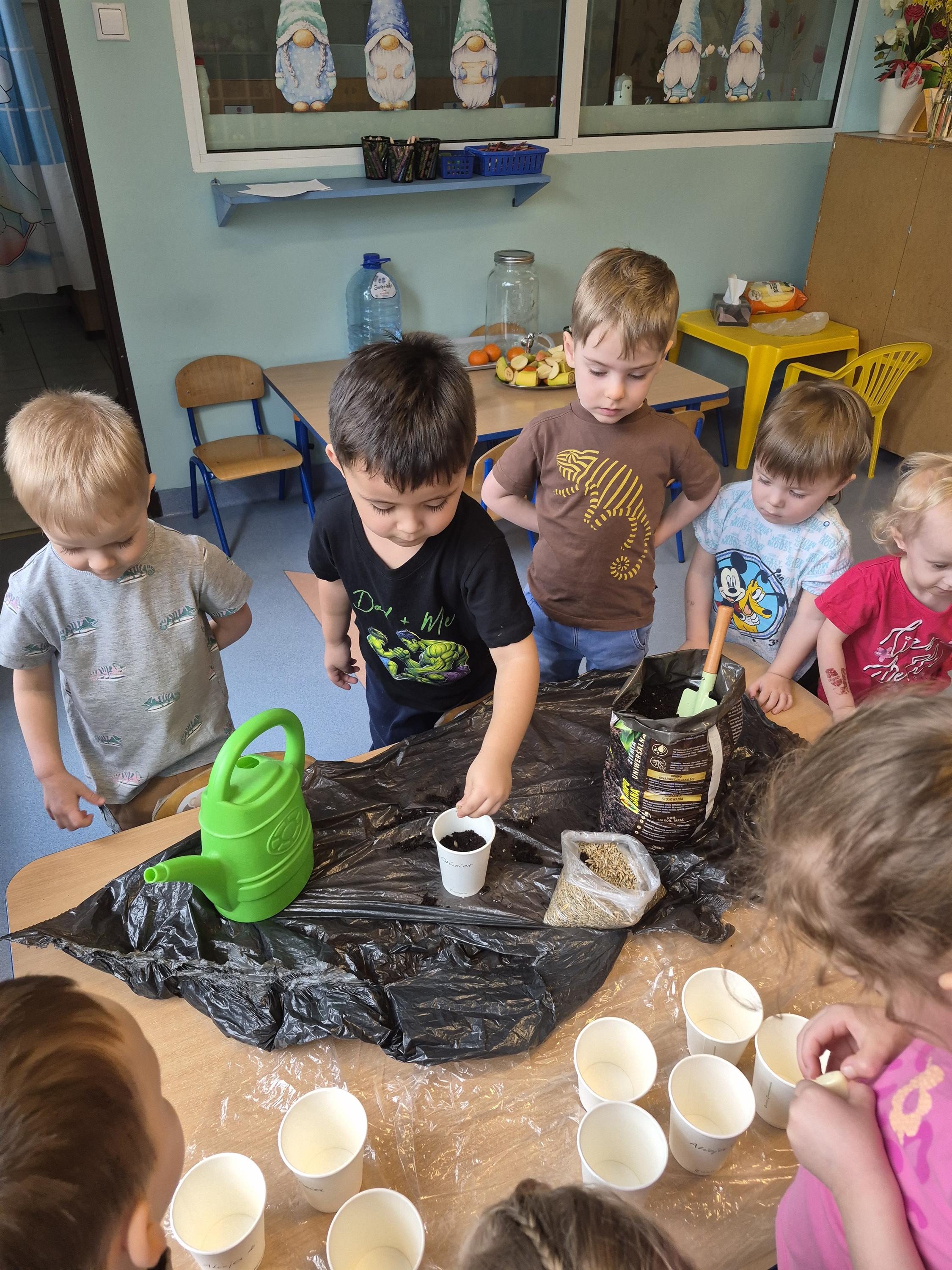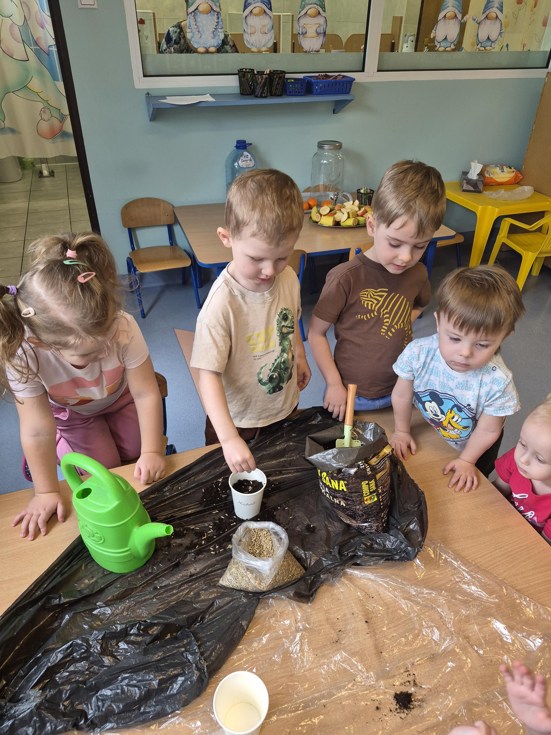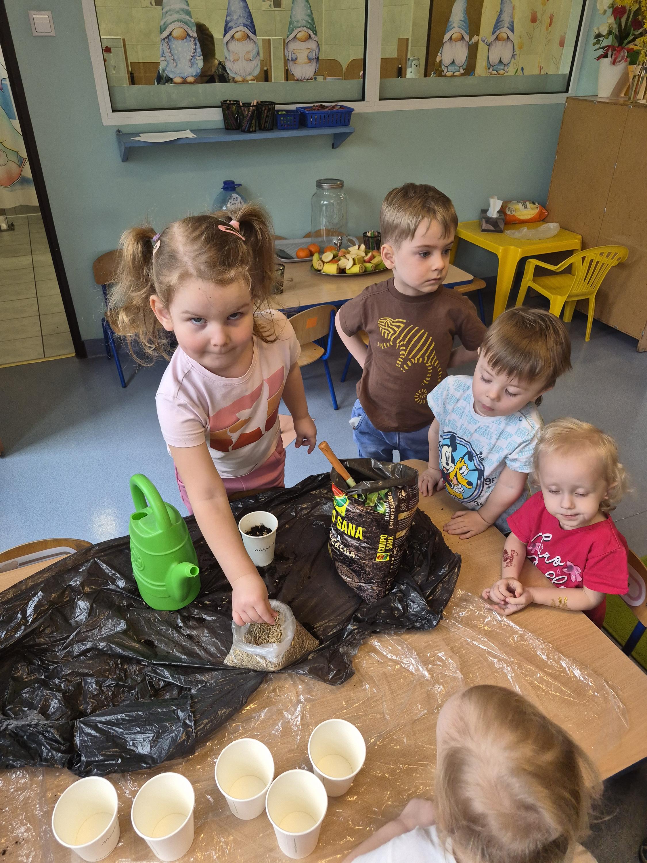 W grupie „Krasnale” odbyły się zajęcia przyrodnicze, podczas których dzieci miały okazję samodzielnie wysiać owies. Każde dziecko otrzymało swoją doniczkę, ziemię oraz nasiona, dzięki czemu mogło krok po kroku poznać proces sadzenia roślin. Dzieci dowiedziały się również czego potrzebuje roślina do wzrostu oraz jak należy o nią dbać.
