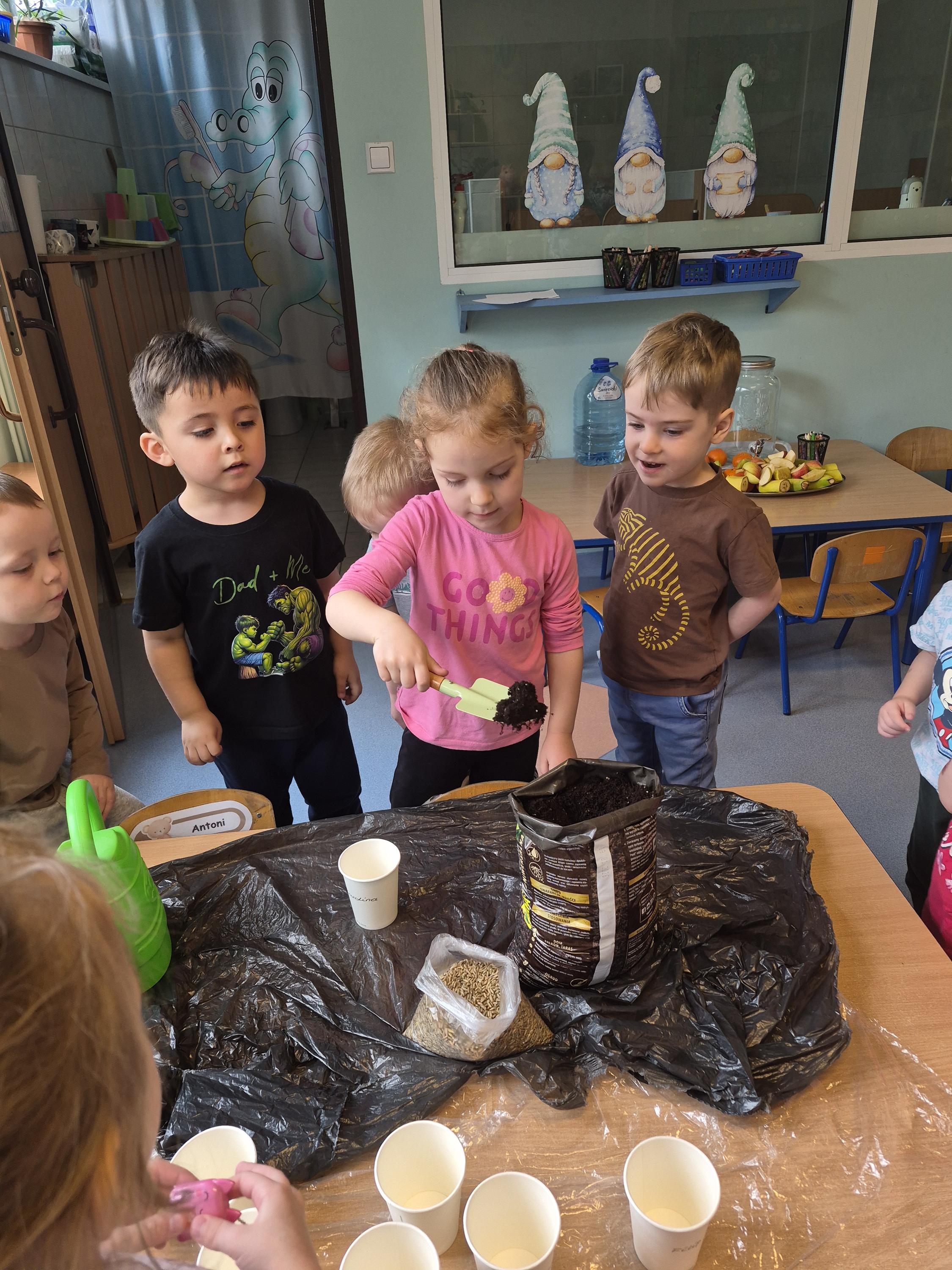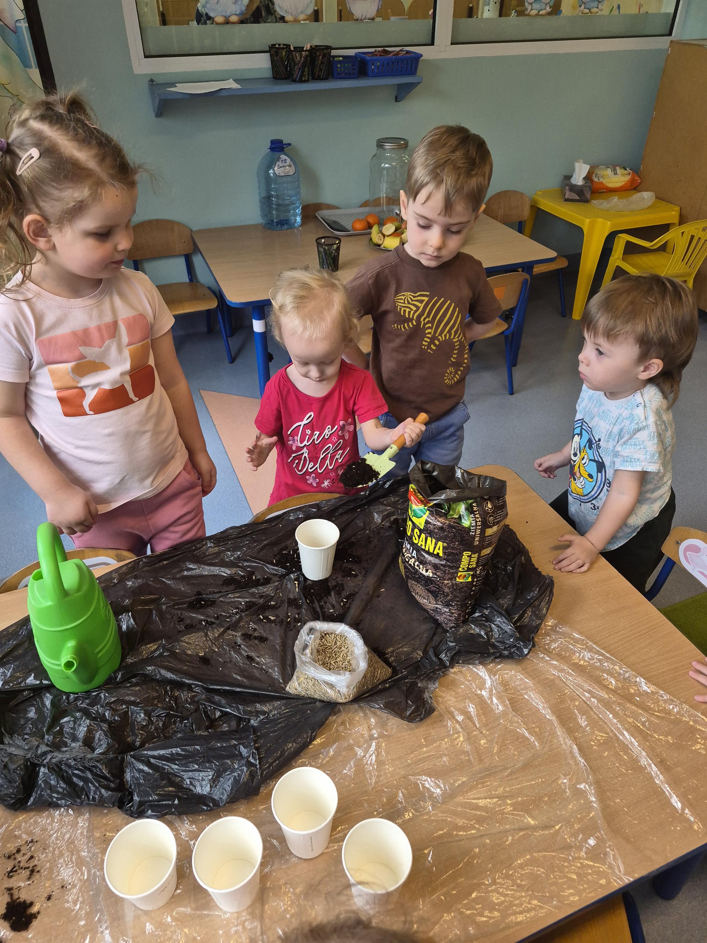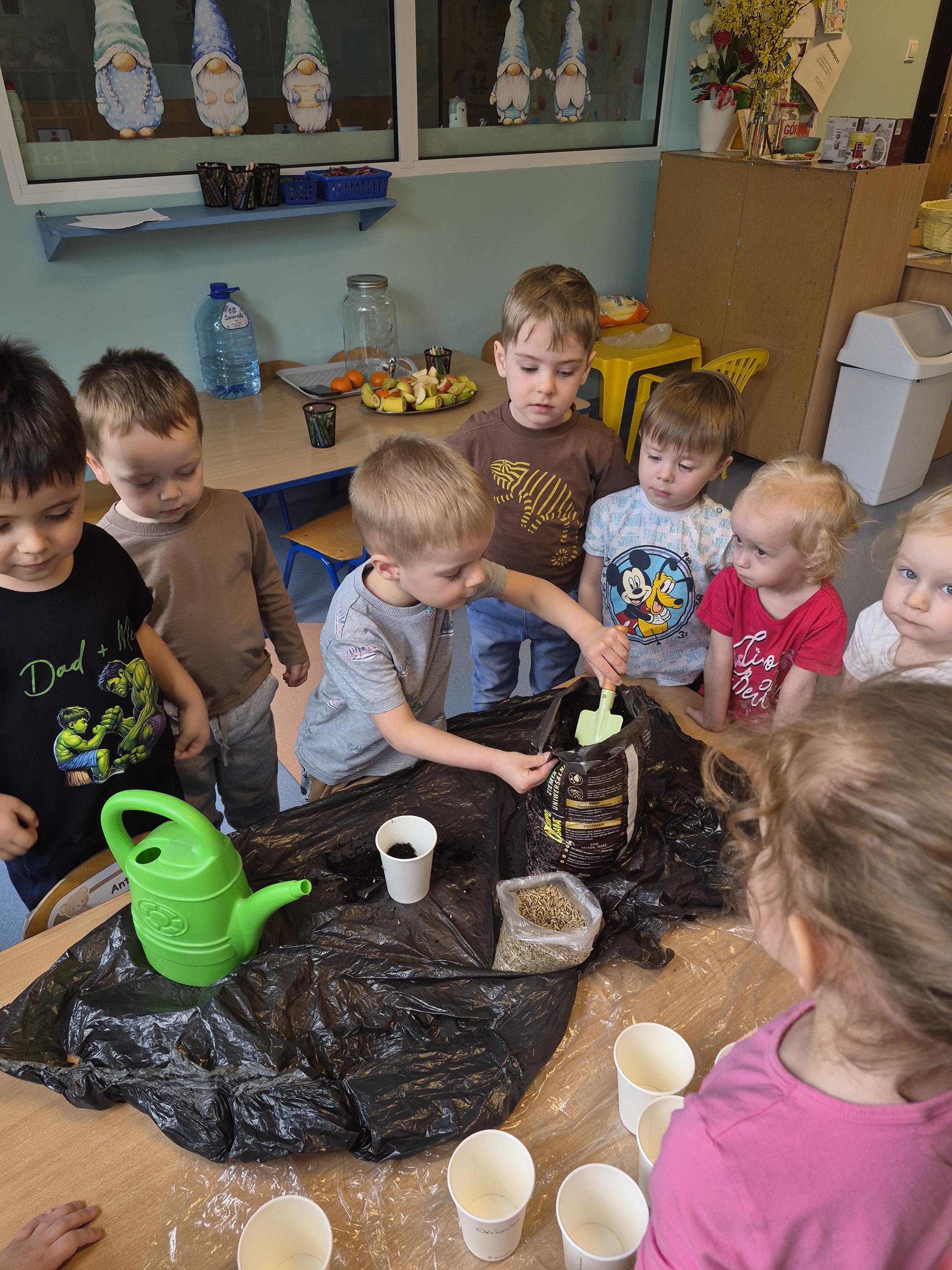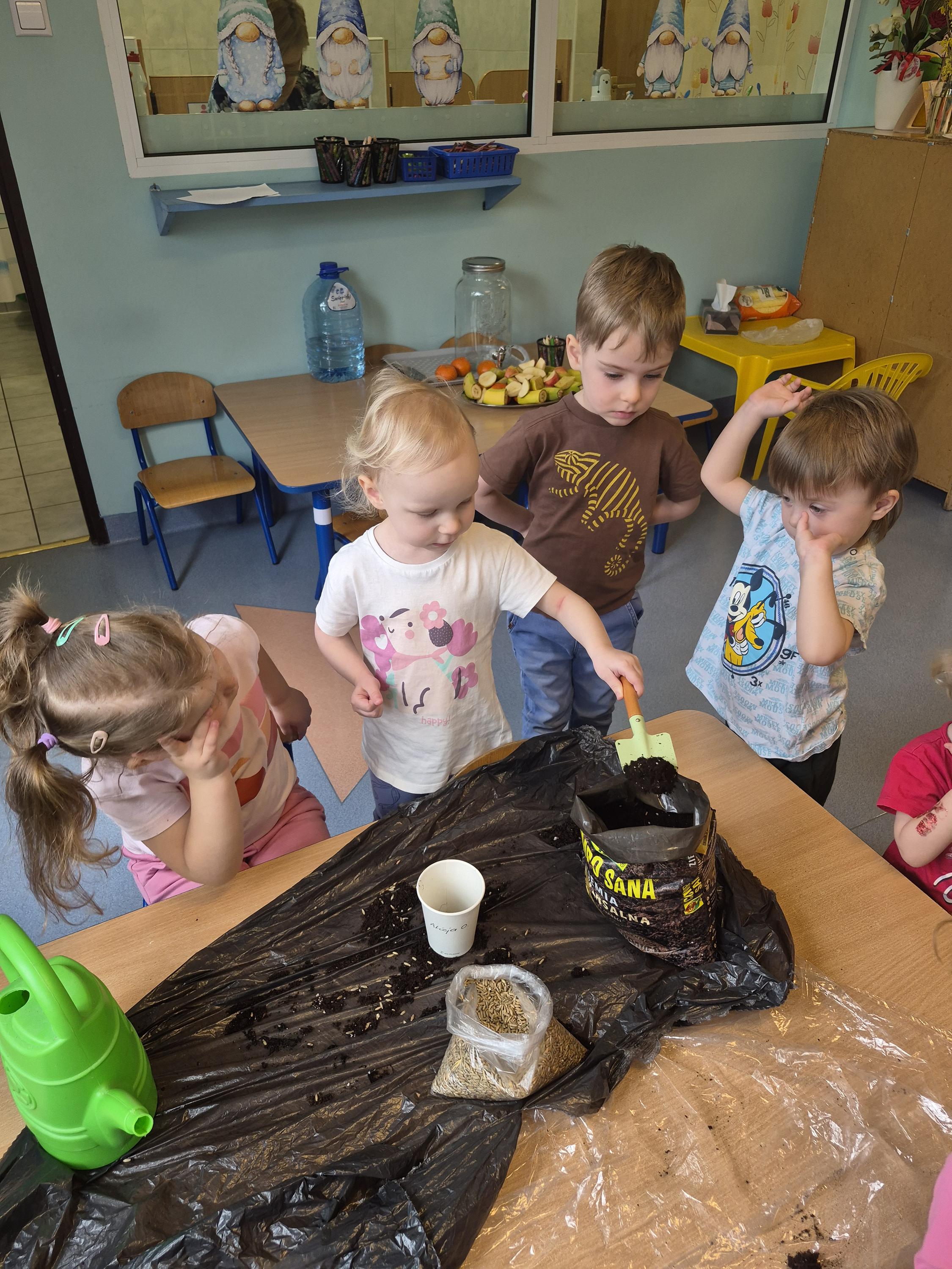 W grupie „Krasnale” odbyły się zajęcia przyrodnicze, podczas których dzieci miały okazję samodzielnie wysiać owies. Każde dziecko otrzymało swoją doniczkę, ziemię oraz nasiona, dzięki czemu mogło krok po kroku poznać proces sadzenia roślin. Dzieci dowiedziały się również czego potrzebuje roślina do wzrostu oraz jak należy o nią dbać.